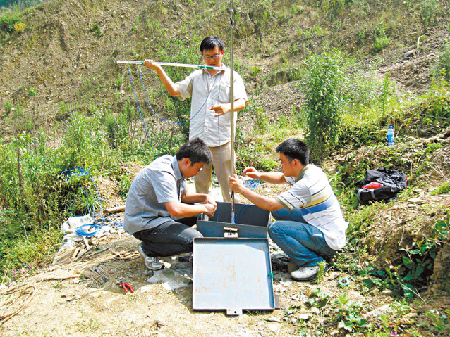 2010年,朱鸿鹄(中)在汶川震区魏家沟布设泥石流传感器,进行泥石流监测