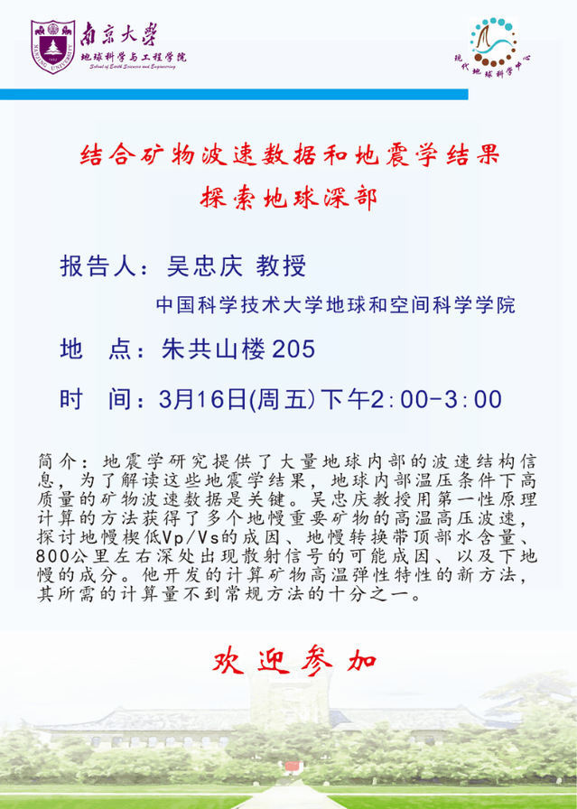 2018-3-16 中科大吴忠庆教授报告:结合矿物波速数据和地震学结果探索地球深部