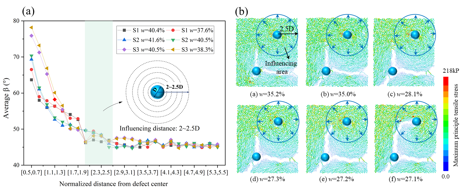 针对这一科学难题,永利官网唐朝生教授课题组创新地采用离散单元法(DEM)构建了耦合土体干缩变形与表面蒸发的数值模型(图2),通过系统模拟含不同尺寸、空间分布及数量配比表面瑕疵的土样干燥过程,定量揭示了表面瑕疵在干缩裂隙形成与发展过程中的关键作用。研究发现,瑕疵点在其周围约2.5倍直径范围内可引发显著的主拉应力集中,进而形成弧形微裂隙,并最终演化为典型的“Y”型裂隙(图3)。一旦已有裂隙进入该影响区,裂隙路径将发生偏转并逐步向瑕疵点汇聚,表现出明显的“裂隙吸引”效应(图4)。此外,表面瑕疵还会打破均质土体中裂隙的级序发育规律,导致裂隙网络呈现出正交与非正交形态共存的特征。该成果首次定量揭示了表面瑕疵结构对土体应力场与开裂模式的主控作用机制,阐明了结构非均质性如何改变裂隙形态与演化路径。这一认识不仅拓展了土体龟裂的理论基础,也为边坡工程、填埋场覆盖层等涉裂结构设计提供了重要科学支撑。