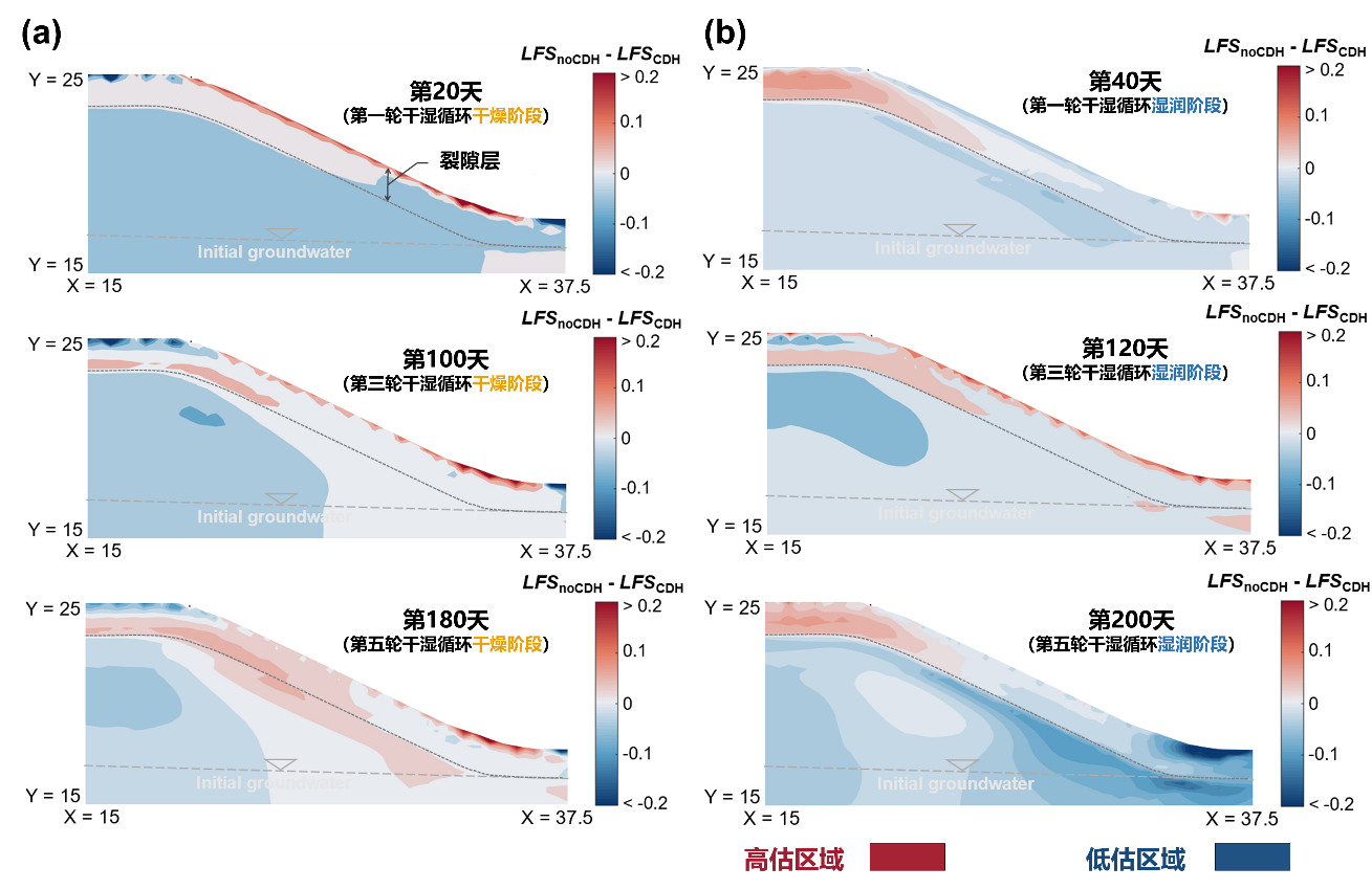图3有无滞回效应下的边坡稳定性空间分布:(a)干燥阶段;(b)湿润阶段