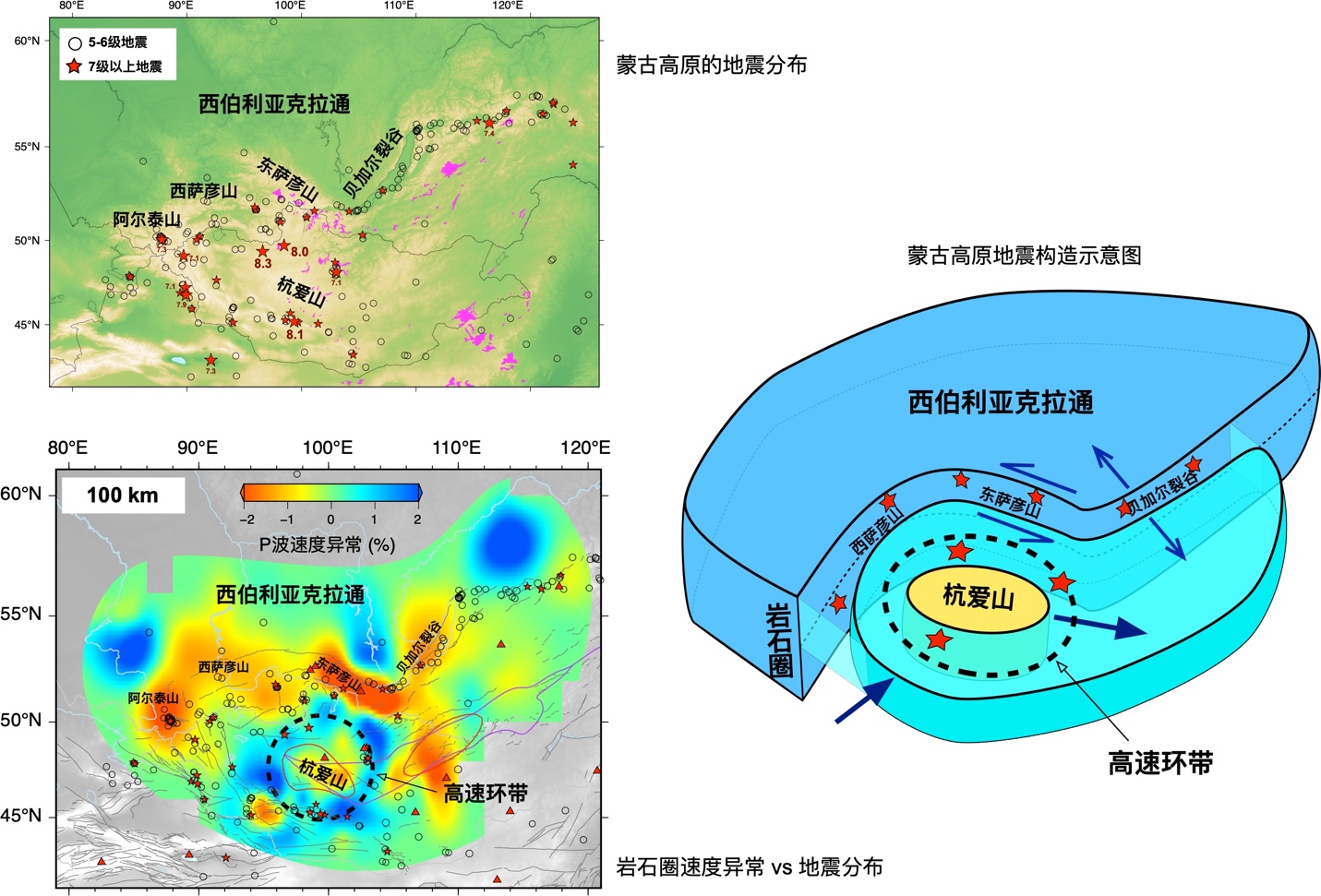 2. 蒙古高原腹地杭爱高原下方为低速异常,其周围是高速异常形成的环带。1900年以来的3次8级大地震均发生在高速环带上,研究认为该岩石圈高速环带支撑了印度-欧亚板块碰撞的远程效应,积累了更多的能量,形成了8级大地震。