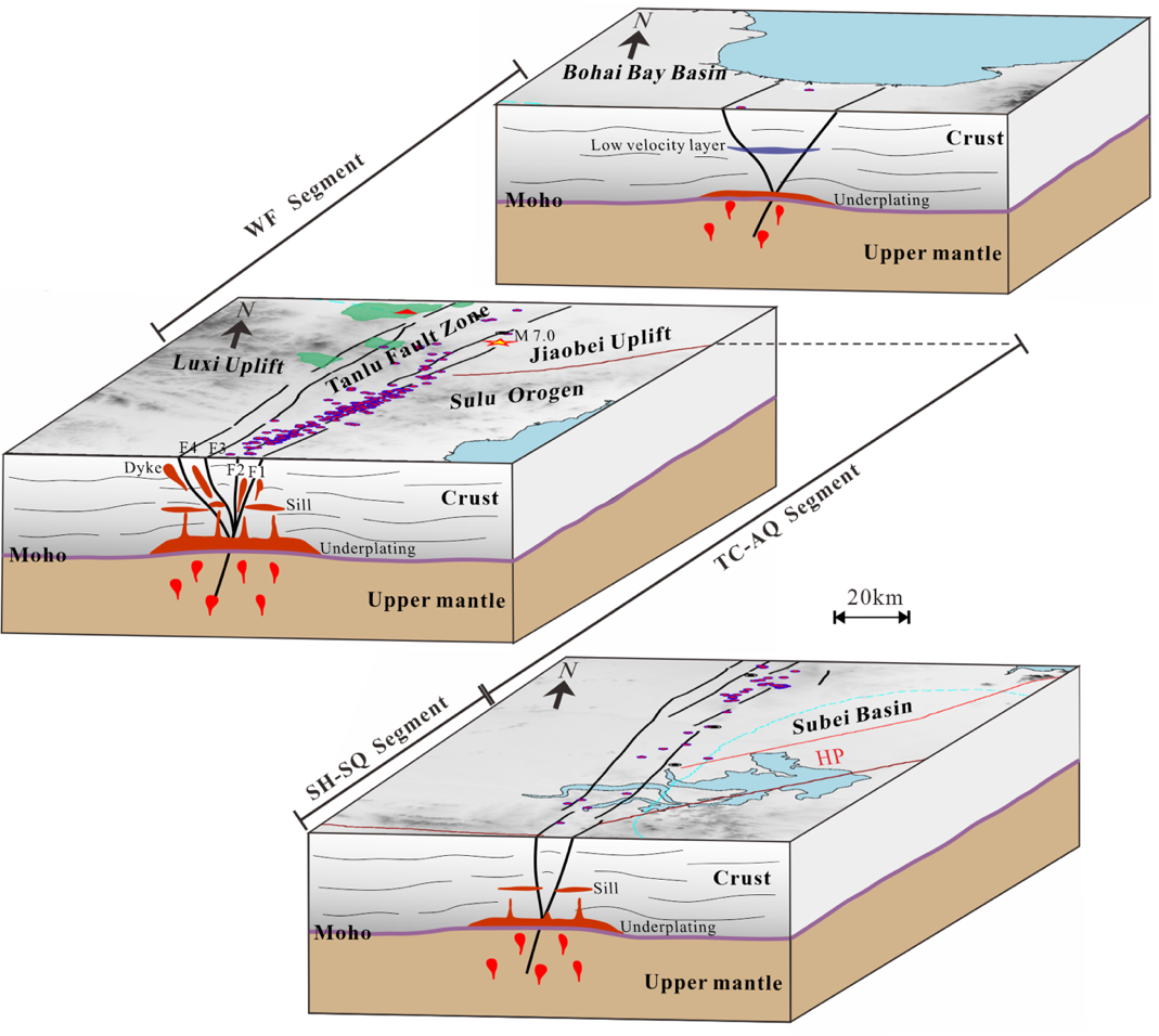 图2 郯庐断裂带中南部不同分段下不同程度的岩浆基底和地震活动。
