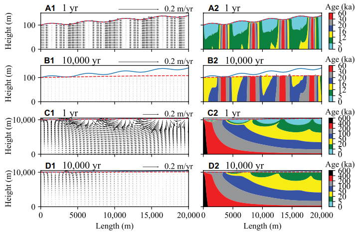 图1.不同厚度含水层的地下水流动过程与年龄分布特征在早全新世(1 yr)和当前(10,000 yr)的对比。A和B为厚度100米的含水层模拟结果,C和D为厚度10,000米的含水层模拟结果(极端情况)。左列显示地下水流场,右列显示地下水年龄分布。图中结果显示地下水补给下降后,流场变化较明显,但是年龄分布规律却没有太大变化(A和B对比、C和D对比)。