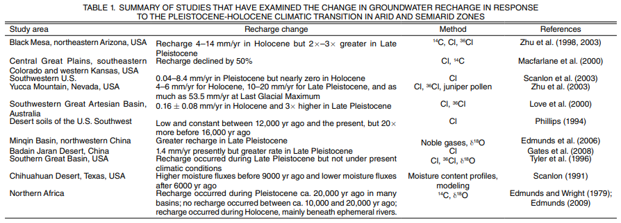 表1.全球部分干旱区更新世-全新世气候转变前后地下水补给变化的文献总结