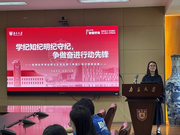 为深入学习贯彻习近平新时代中国特色社会主义思想和党的二十大精神,引导全体党员学纪、知纪、明纪、守纪,6月13日中午,地科院地化专业博士生党支部在朱共山楼A205会议室举行党纪学习教育主题党日活动,开展《中国共产党纪律处分条例》(以下简称《条例》)知识竞答比赛。会议由党支部书记严子妮同志主持,永利304官网唯一党委常委、副校长,学院联系支部党委委员陆现彩老师出席会议。