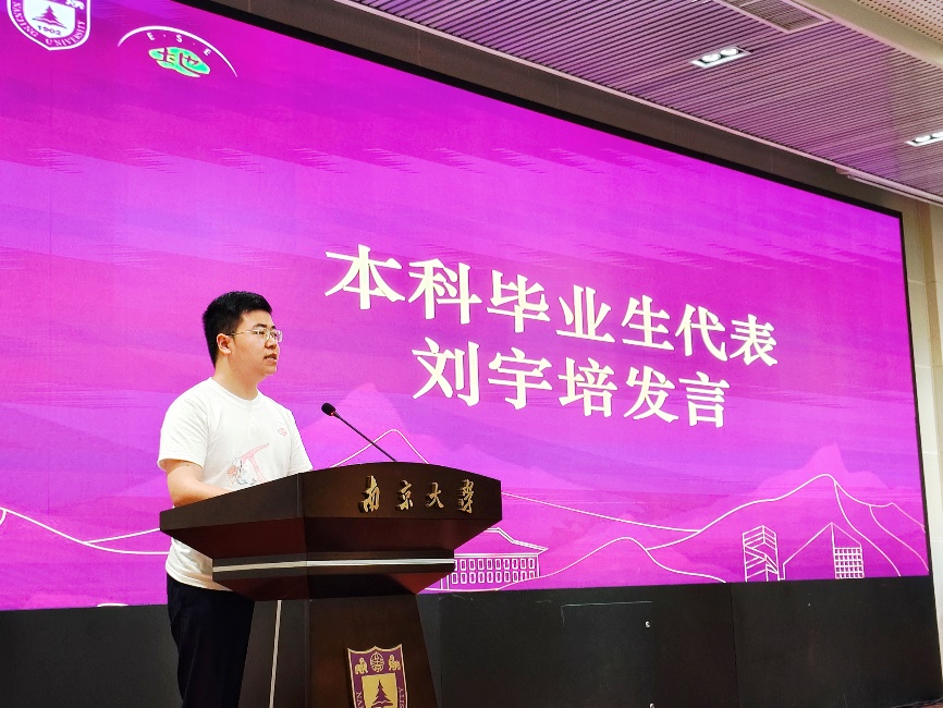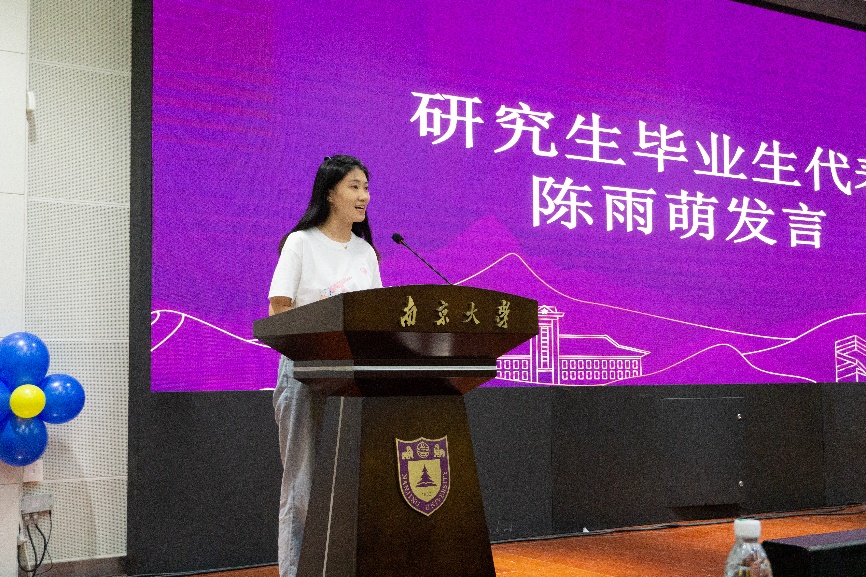 硕士毕业生陈雨萌同学生在发言中感谢师恩,并誓言将所学贡献于国家发展建设。她表示毕业生们将铭记责任,勇于担当,肩负起时代之责,发挥好青年中流砥柱的作用,在国家发展建设的广阔舞台上,传递和弘扬“嚼得菜根,做得大事”的南大精神。其次作为南大学子,应当不负韶华,从容面对未来艰难挑战,继承南大地科榜样力量,传承南大品质精神,在逆境中坚持、在困难中崛起、在黑暗中传递温暖与明亮,为全面建设社会主义现代化国家贡献青春力量。最后,她祝愿学校、学院和老师未来更加美好。