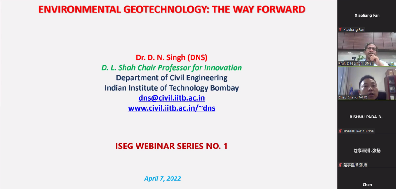 2022年4月7日,由永利官网承办的国际环境岩土工程学会(ISEG)网络系列研讨会顺利启动。研讨会首期嘉宾为印度国家工程院院士、Environmental Geotechnics期刊主编D.N. Singh教授。ISEG主席永利官网施斌教授、ISEG秘书长永利官网唐朝生教授、ISEG副主席、理事等国内外近400人参加了此次会议。
