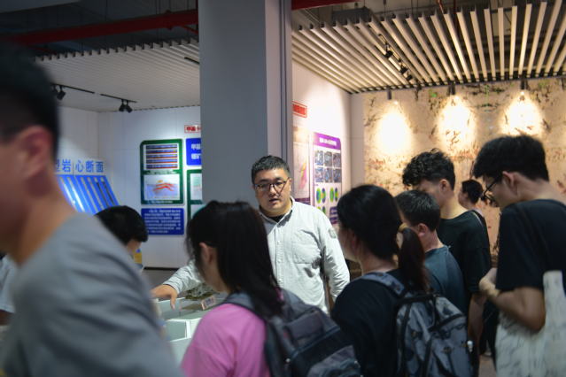 在郑碧海和许云云两位老师的带领下,同学们首先观察了汶川地震断裂带岩心、超高压变质岩岩心等珍贵样本,了解其形成过程与科研价值。这些岩心被称为“深入地球的望远镜”,为研究地质灾害和资源勘探提供了关键数据。通过多媒体展区,同学们沉浸式体验了大陆科学钻探的全流程,从钻探工具到深海岩心存储系统,感受科技与地学的深度融合。
