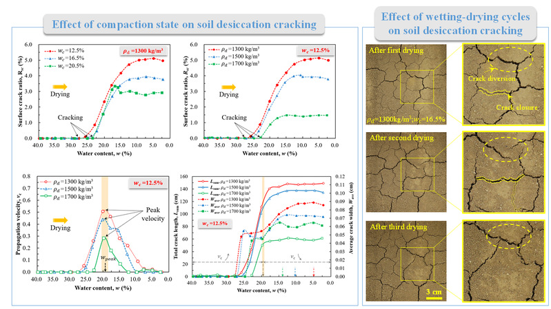 近几十年来,为加深对土体干缩开裂机制的理解,国内外学者对影响土体干缩开裂的重要因素进行了探究,其中包括矿物成分、土层厚度等内部因素和边界条件、温湿度等外部因素。但以往的试验研究大多是在泥浆试样上进行的,工程中压实土体的工程性质与泥浆样存在显著差异。对压实黏性土而言,不同的初始含水率和压实度会导致土体呈现迥异的微观结构和水-力学行为。为此,唐朝生教授课题组对压实黏性土开展了一系列干缩开裂试验,重点考虑了不同压实条件(含水率和干密度)下土体裂隙的发育特征以及干湿循环对土体裂隙演化的影响。研究结果表明,土体裂隙率随压实含水率和干密度增加而明显减小。经过干湿循环作用的土体裂隙显著增加,并且这种趋势在高压实含水率和干密度的试样中更为明显。压实黏土在不同压实条件和干湿循环作用下的裂隙发育差异与土体的微观结构有关。本研究有望为地质和岩土工程中黏土材料的工程设计提供参考。