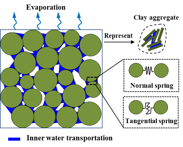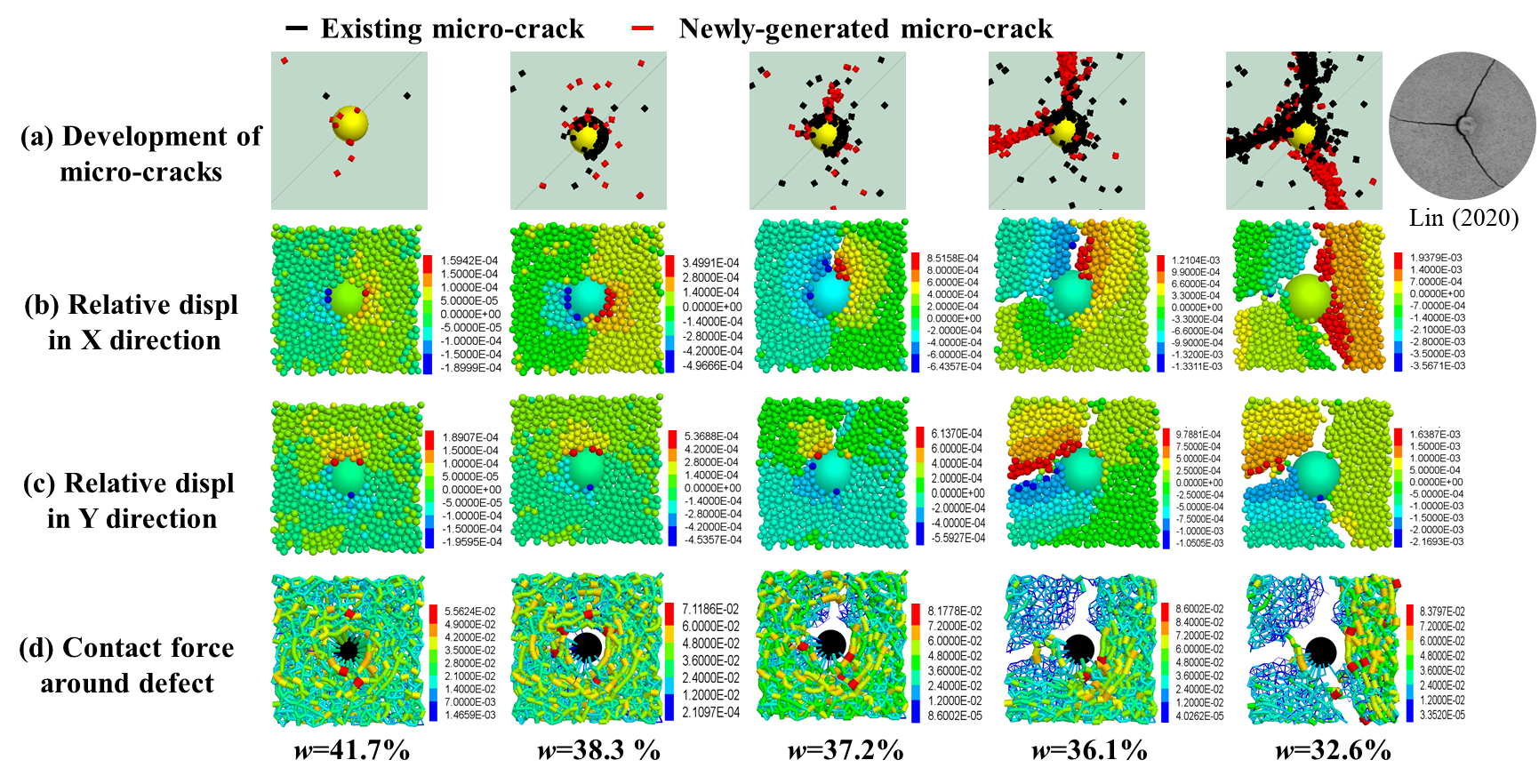 针对这一科学难题,永利官网唐朝生教授课题组创新地采用离散单元法(DEM)构建了耦合土体干缩变形与表面蒸发的数值模型(图2),通过系统模拟含不同尺寸、空间分布及数量配比表面瑕疵的土样干燥过程,定量揭示了表面瑕疵在干缩裂隙形成与发展过程中的关键作用。研究发现,瑕疵点在其周围约2.5倍直径范围内可引发显著的主拉应力集中,进而形成弧形微裂隙,并最终演化为典型的“Y”型裂隙(图3)。一旦已有裂隙进入该影响区,裂隙路径将发生偏转并逐步向瑕疵点汇聚,表现出明显的“裂隙吸引”效应(图4)。此外,表面瑕疵还会打破均质土体中裂隙的级序发育规律,导致裂隙网络呈现出正交与非正交形态共存的特征。该成果首次定量揭示了表面瑕疵结构对土体应力场与开裂模式的主控作用机制,阐明了结构非均质性如何改变裂隙形态与演化路径。这一认识不仅拓展了土体龟裂的理论基础,也为边坡工程、填埋场覆盖层等涉裂结构设计提供了重要科学支撑。