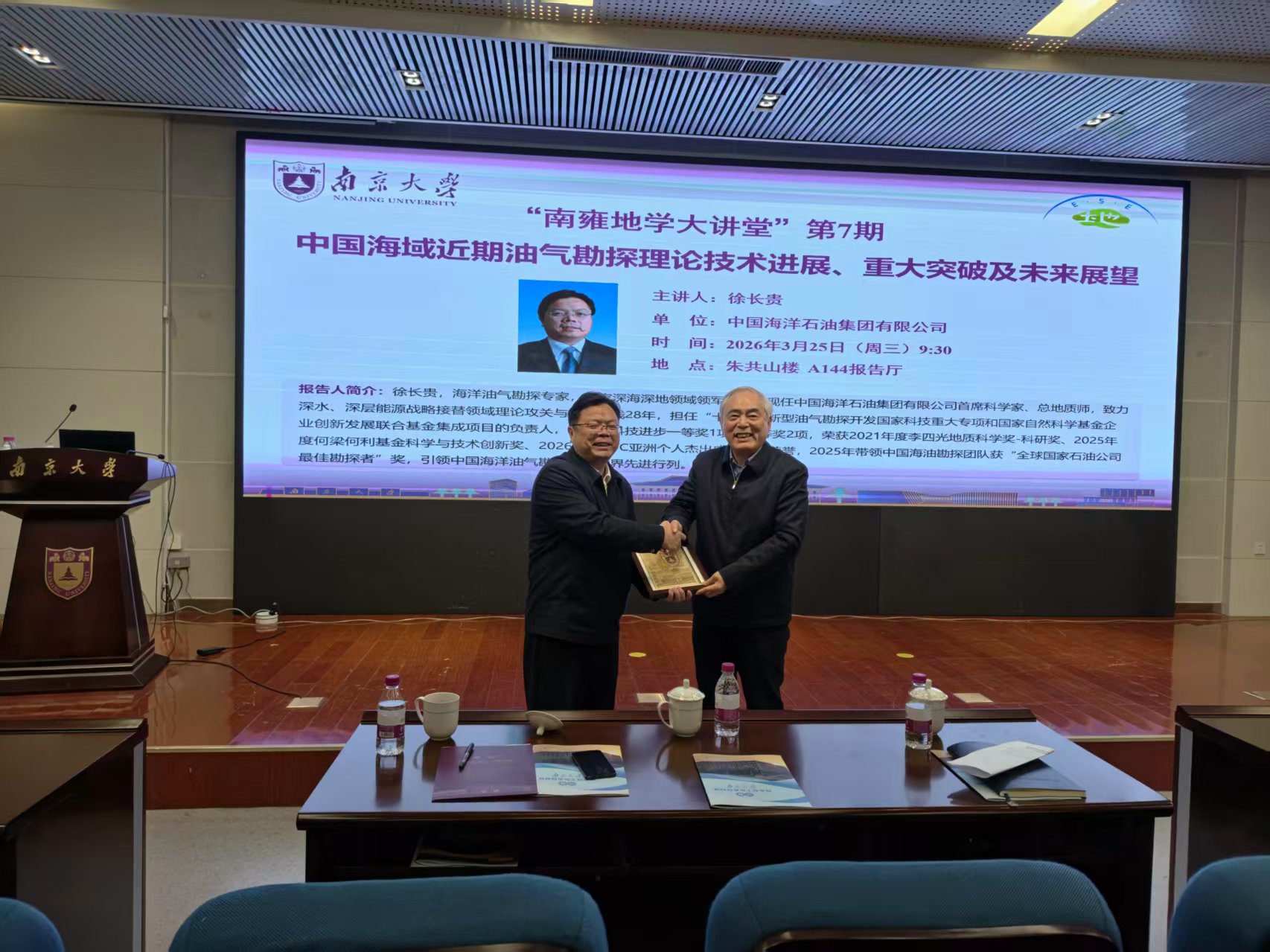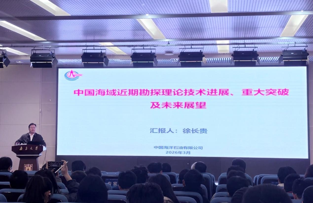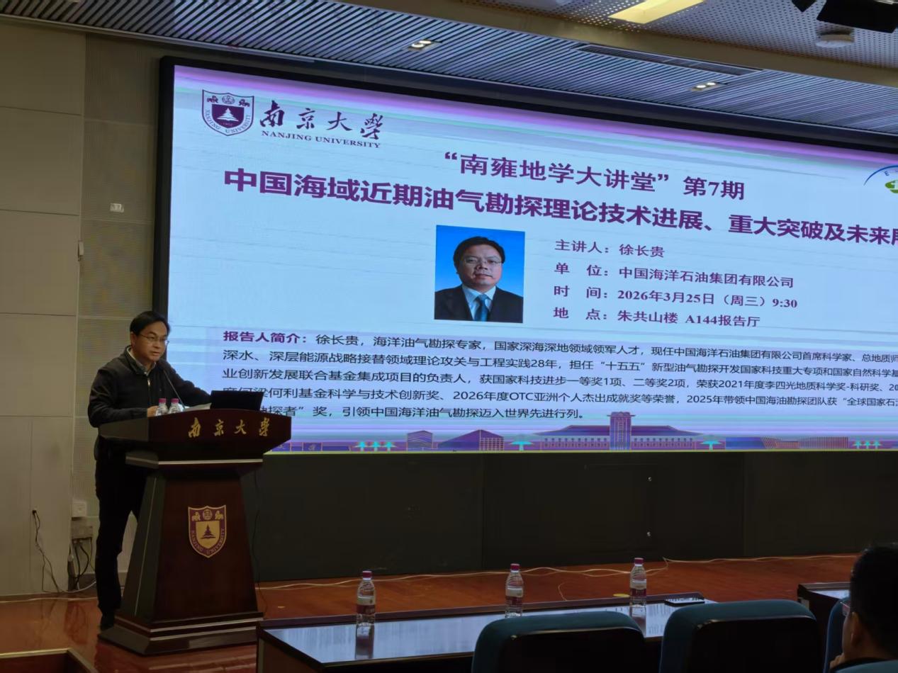2026年3月25日上午,永利304官网唯一“南雍地学大讲堂”第七期学术报告会在朱共山楼成功举行。本期大讲堂特邀中国海洋石油集团公司首席科学家、有限公司总地质师,著名海洋油气勘探专家徐长贵作题为“中国海域近期油气勘探理论技术进展、重大突破及未来展望”的专题报告。报告会由陈天宇院长主持,陈骏院士等专家出席,校内外三百余名师生参加。