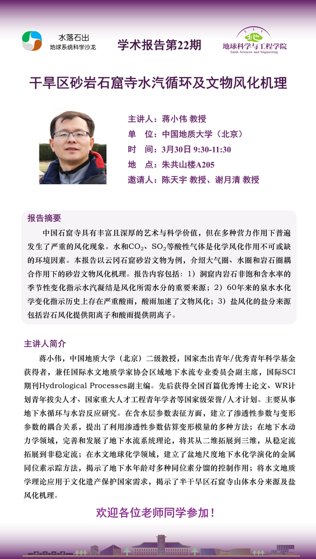 “水落石出”地球系统科学沙龙学术报告第22期——干旱区砂岩石窟寺水汽循环及文物风化机理
