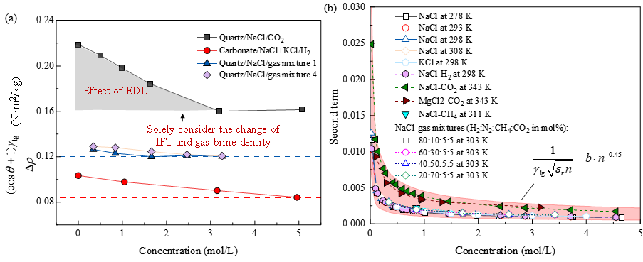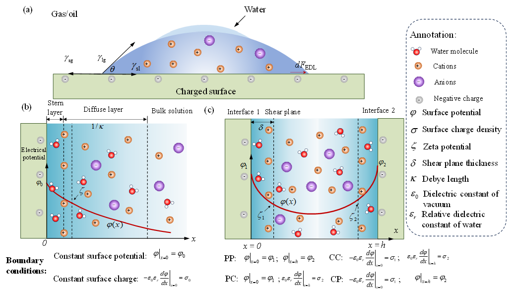 岩石润湿性是影响多孔介质中多相流动行为的关键因素,在油气开发、二氧化碳地质封存和地下氢气储存等领域具有重要意义。长期以来,学界普遍认为,润湿性主要受界面张力和矿物表面性质控制。近年来,大量实验研究进一步表明,岩石—水界面的双电层(Electrical Double Layer)同样对润湿性具有重要影响。然而,由于双电层作用机制复杂,现有理论模型仍存在参数较多、适用范围有限等问题,岩石润湿性的调控机理尚不清晰。