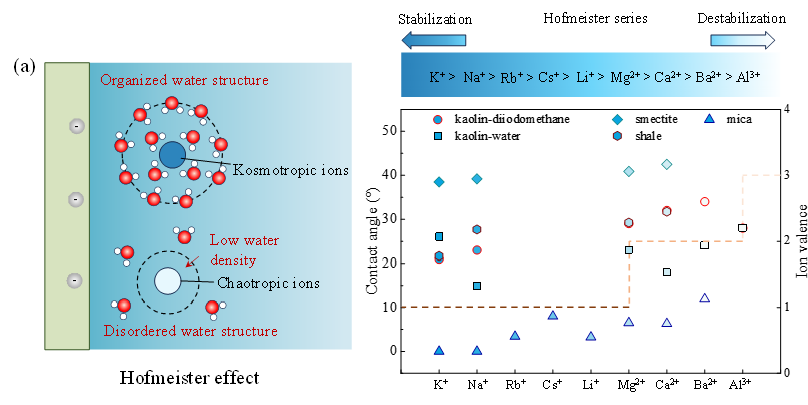 图4 (a)Hofmeister效应示意图,(b)阳离子类型对于不同岩石润湿性的影响