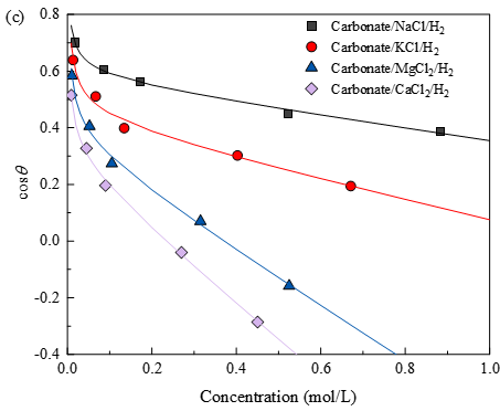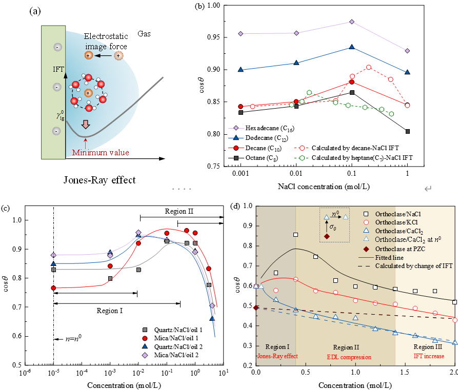 研究结果表明,在气/水/岩体系中,润湿性随表面电荷或表面电势平方的增加而增强;在油/水/岩体系中,接触角主要受油水界面与岩水界面流动电位之和的影响。进一步研究发现,在低盐度条件下,双电层压缩效应对润湿性的影响超过界面张力变化;在较宽盐度范围内,润湿性随盐度变化呈现非单调规律,可划分为Jones–Ray效应、双电层压缩效应和界面张力变化三个主导阶段。此外,在引入Hofmeister效应后,模型还能够解释不同离子类型对润湿性的差异性影响。