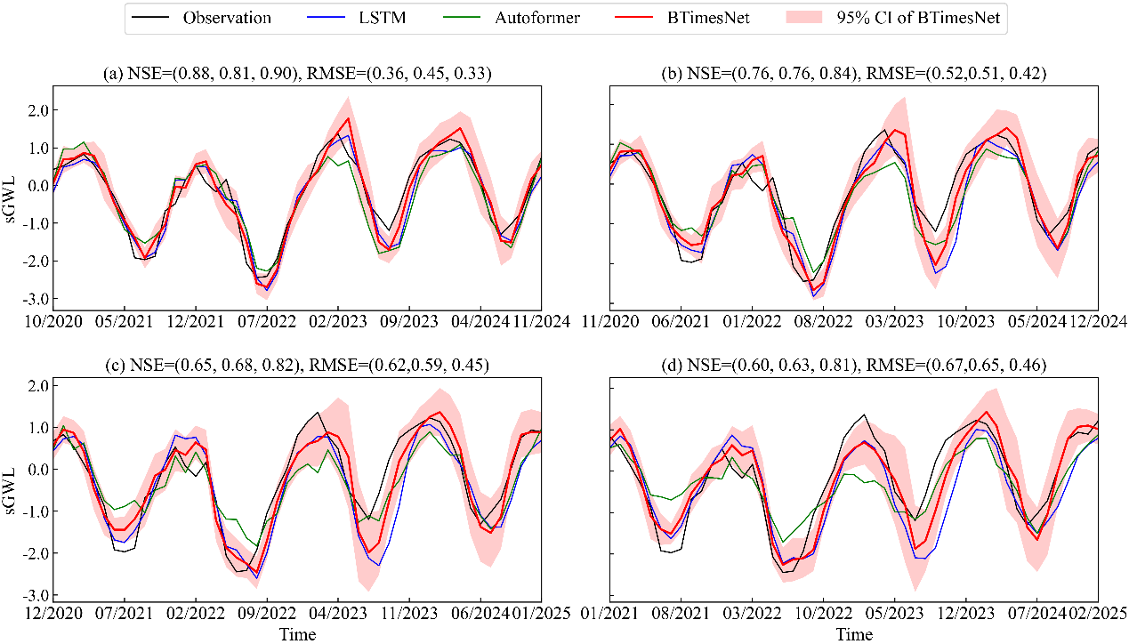 上述研究成果为地下水位的长期概率预测提供了更可靠的框架,有望在干旱预警、水资源调度与地下水可持续利用等领域发挥重要作用,体现了深度学习在地球系统科学中的广泛应用前景。该成果在近期以“An explainable Bayesian TimesNet for probabilistic groundwater level prediction”为题,发表于国际水文学领域权威期刊《Water Resources Research》,硕士研究生彭泽辰为论文第一作者,莫绍星助理教授和吴吉春教授为通讯作者,合作者包括永利304官网唯一曾献奎副教授和施小清教授、德克萨斯大学奥斯汀分校lexander Y. Sun教授等。该研究得到国家自然科学基金项目(U2443201、42330718、42472321)资助。