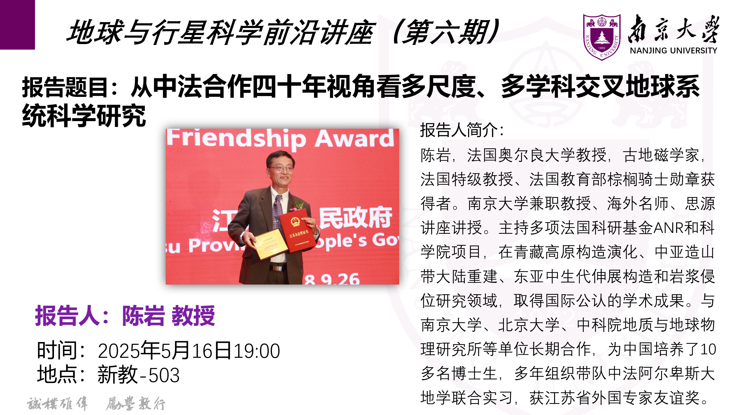 学院邀请了国际著名学者、法国奥尔良大学陈岩教授带来题为《从中法合作四十年视角看多尺度、多学科交叉地球系统科学研究》的精彩报告,为师生呈现了一场学术盛宴。学术讲座于516日在鼓楼校区新教学楼503教室举行,会议由王博副院长主持。