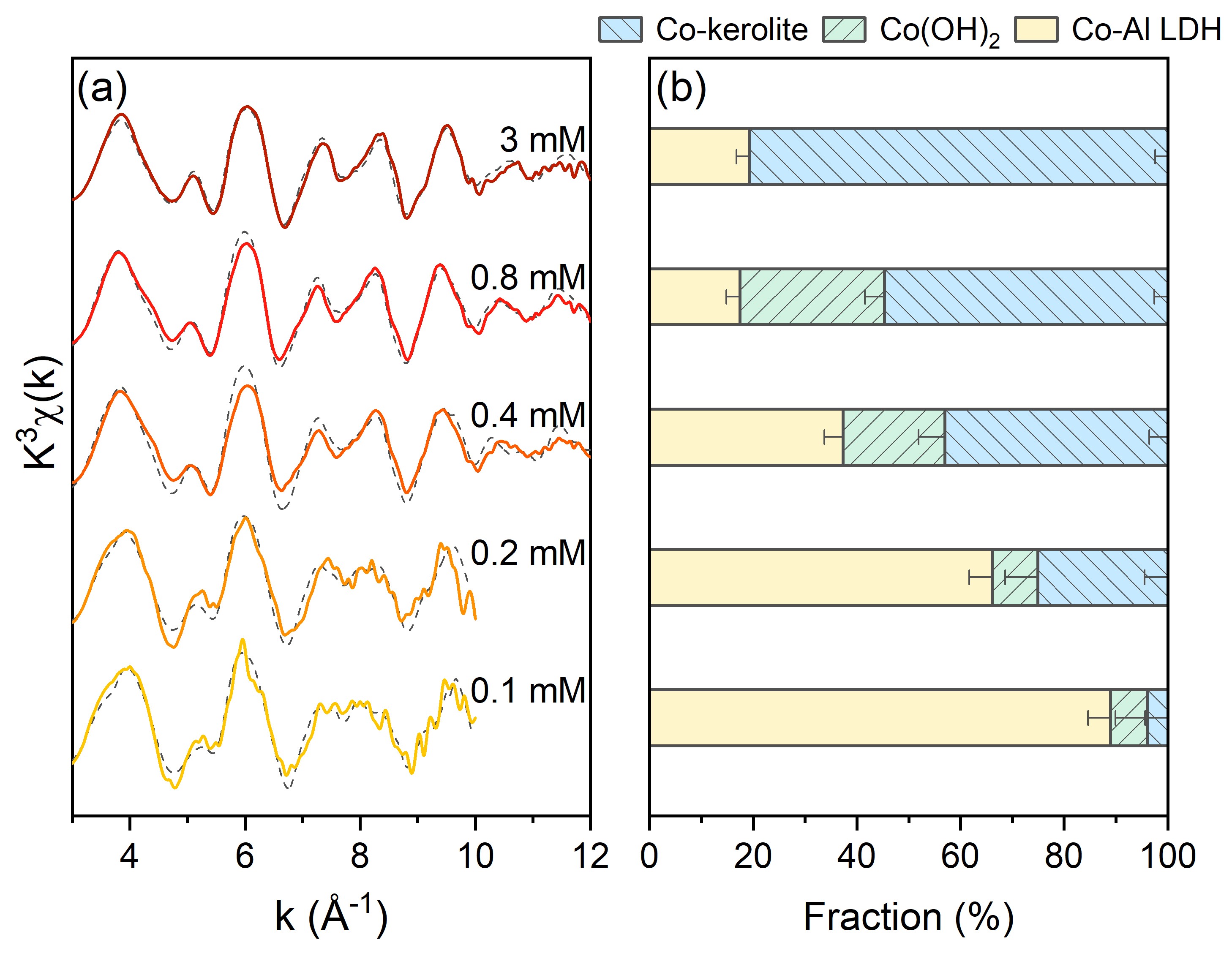 【图2 不同钴浓度下EXAFS谱图及LCF分析揭示主导沉淀类型随钴浓度呈规律性演变】