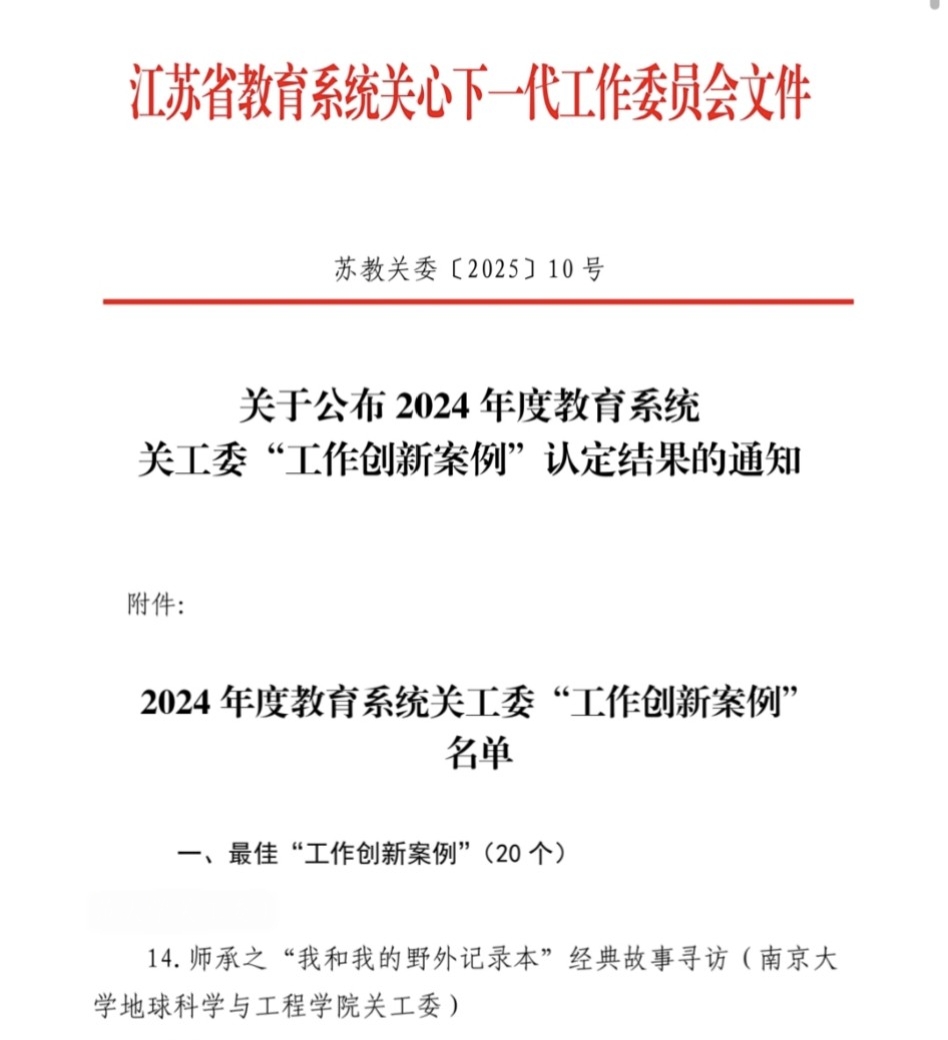 近日,江苏省教育系统关工委公布了2024 年度教育系统关工委“工作创新案例”入选结果,学院关工委案例《师承之“我和我的野外记录本”经典故事寻访》被评为最佳案例。