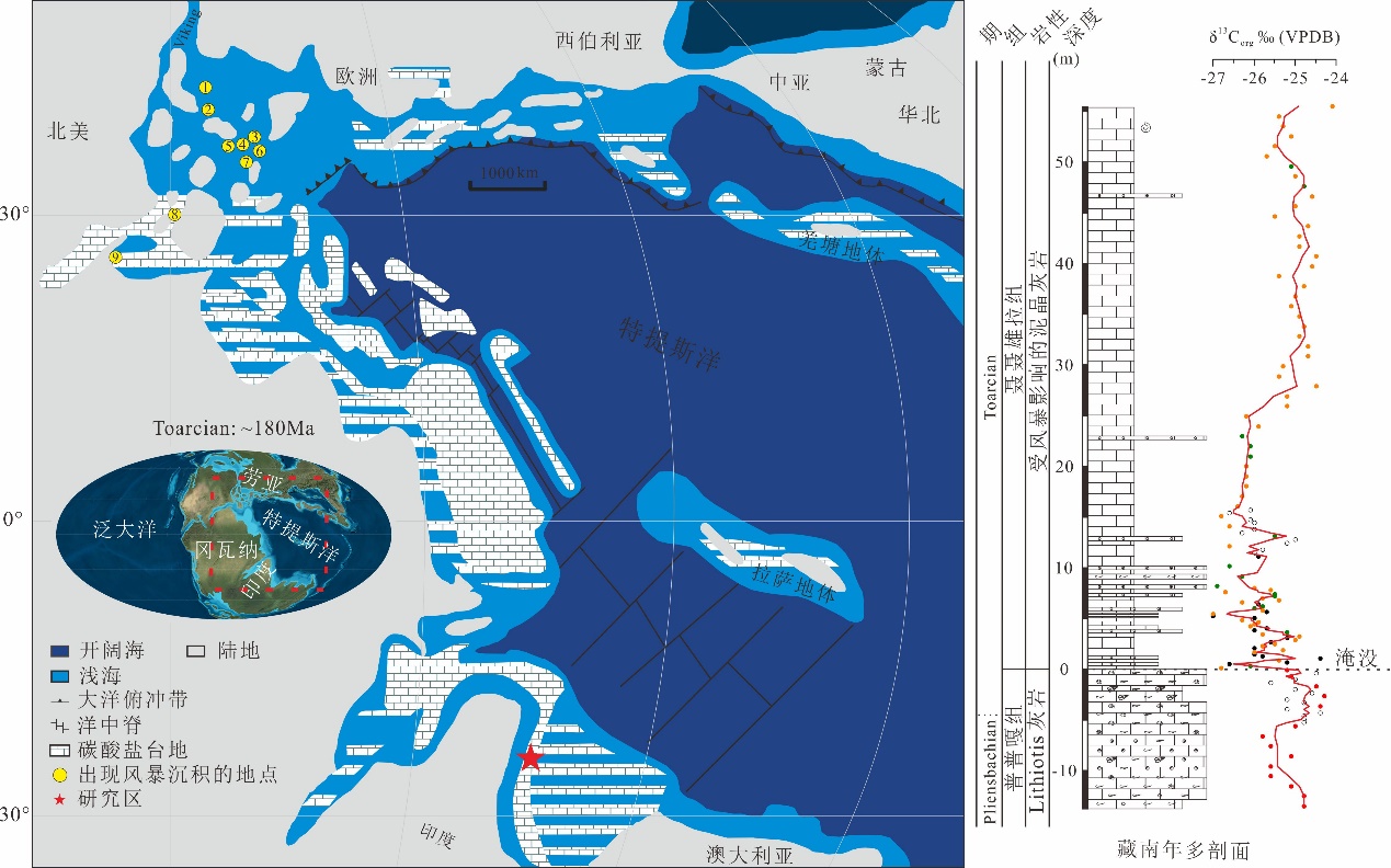 侏罗纪Toarcian大洋缺氧事件特提斯洋古地理重建图,红星代表研究剖面。黄圈显示热带风暴剖面点;右侧为论文研究的藏南有机碳同位素曲线,显示大洋缺氧事件时期碳酸盐台地淹没,有机质碳同位素负偏,对应于轻碳释放。 |