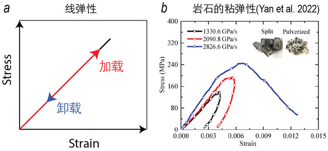 图1:左:理想线弹性的应力应变关系。右:不同加载速率下岩石的应力应变关系,具有粘弹性特征