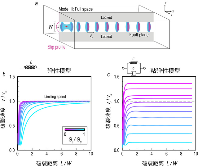 图2:(a)地震破裂模型概念图,(b)弹性破裂趋于极限速度,(c)粘弹性破裂存在任意终端速度