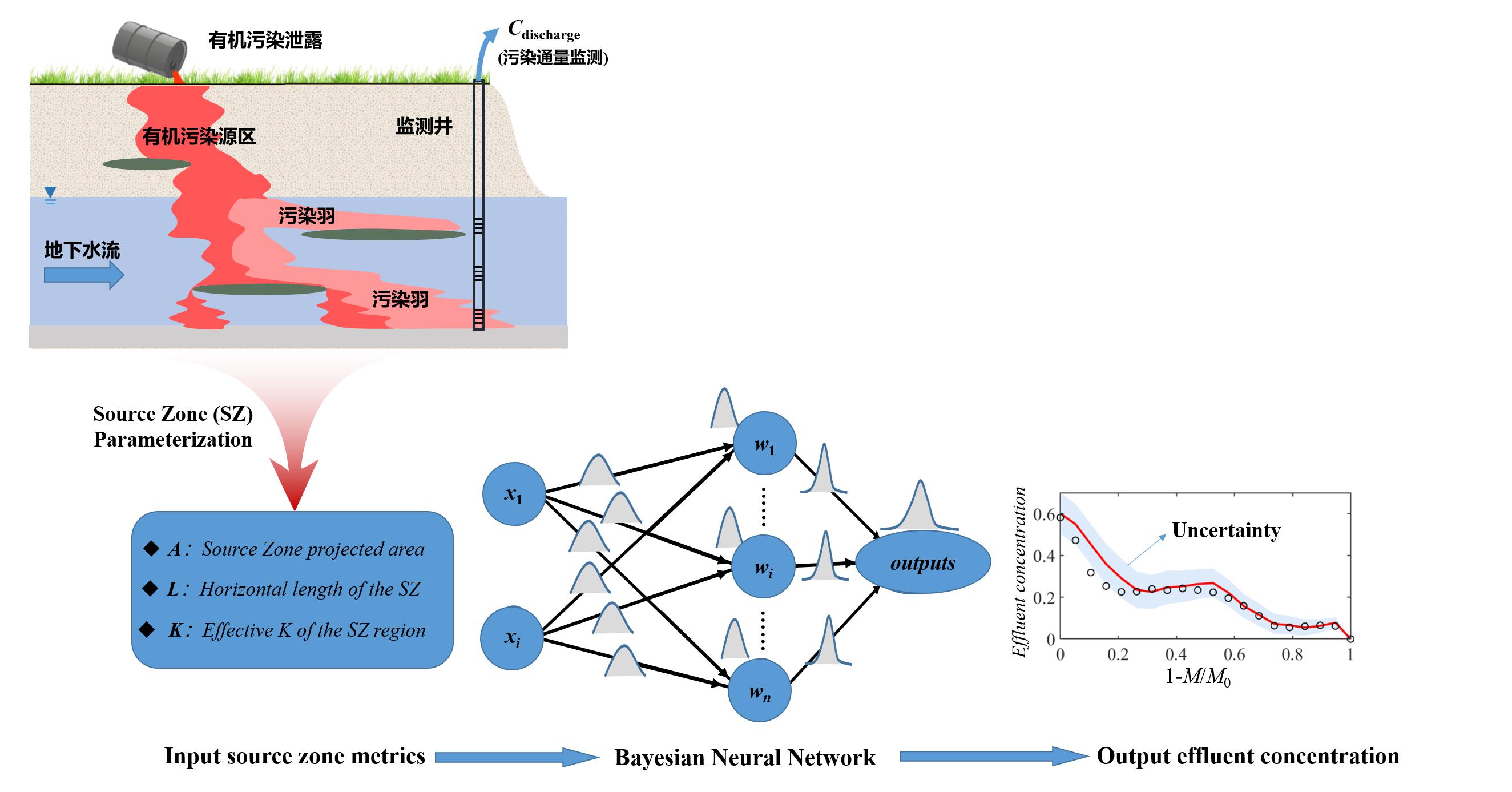 近日,永利官网吴吉春教授与施小清教授研究团队提出了一种基于可解释性神经网络研究地下水有机污染源-羽质量传输机制与污染通量预测的新方法。针对“有机污染源结构-污染羽”之间强非线性难表征的问题,研究团队构建了贝叶斯神经网络框架,首次从数据驱动的角度学习“有机污染源-羽”之间的复杂关系,并通过机器学习反向解译技术“期望梯度法”(Expected Gradients)剖析了有机污染源多阶段非线性溶出的物理成因及主控因素,发现污染源衰减初期的污染通量峰值主要受控于低饱和污染源的垂向展布,而衰减后期的污染通量拖尾值主要受高饱和污染源的横向长度与渗透性的综合控制。基于上述理论发现,研发了基于深度学习的有机污染源溶解升尺度预测模型,仅凭少量源区结构参数即可精准模拟多阶段非线性溶解过程,可为有机污染场地管控及风险评估提供有力的技术支撑。