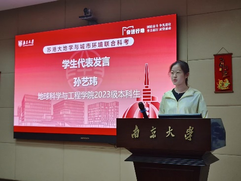 在发言环节,科考项目负责人谭道远老师介绍了项目整体目标与主要内容。他表示,此次联合科考聚焦香港独特的地质环境及城市化进程中的现实挑战,重点围绕海岸地貌演变、滑坡泥石流防治、恐龙化石发掘等专题,组织开展野外考察、城市环境调研及系列讲座。科考期间,项目将邀请香港大学、香港理工大学、岭南大学等多所高校的知名教授联合指导,促进苏港两地学术交流,提升同学们的跨学科能力和国际视野。同时,他特别强调了野外安全和团队纪律,寄语同学们“平安出访,满载而归”。永利304官网唯一2023级本科生孙艺玮代表全体队员郑重承诺,将以严谨务实的态度投身科考实践,深入探索香港环境与社会发展问题,在跨学科协作中锤炼解决复杂问题的能力,不负学校重托。