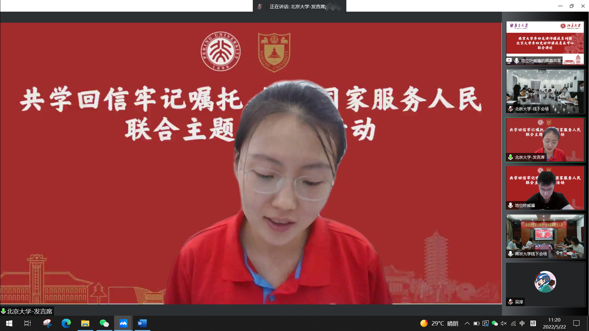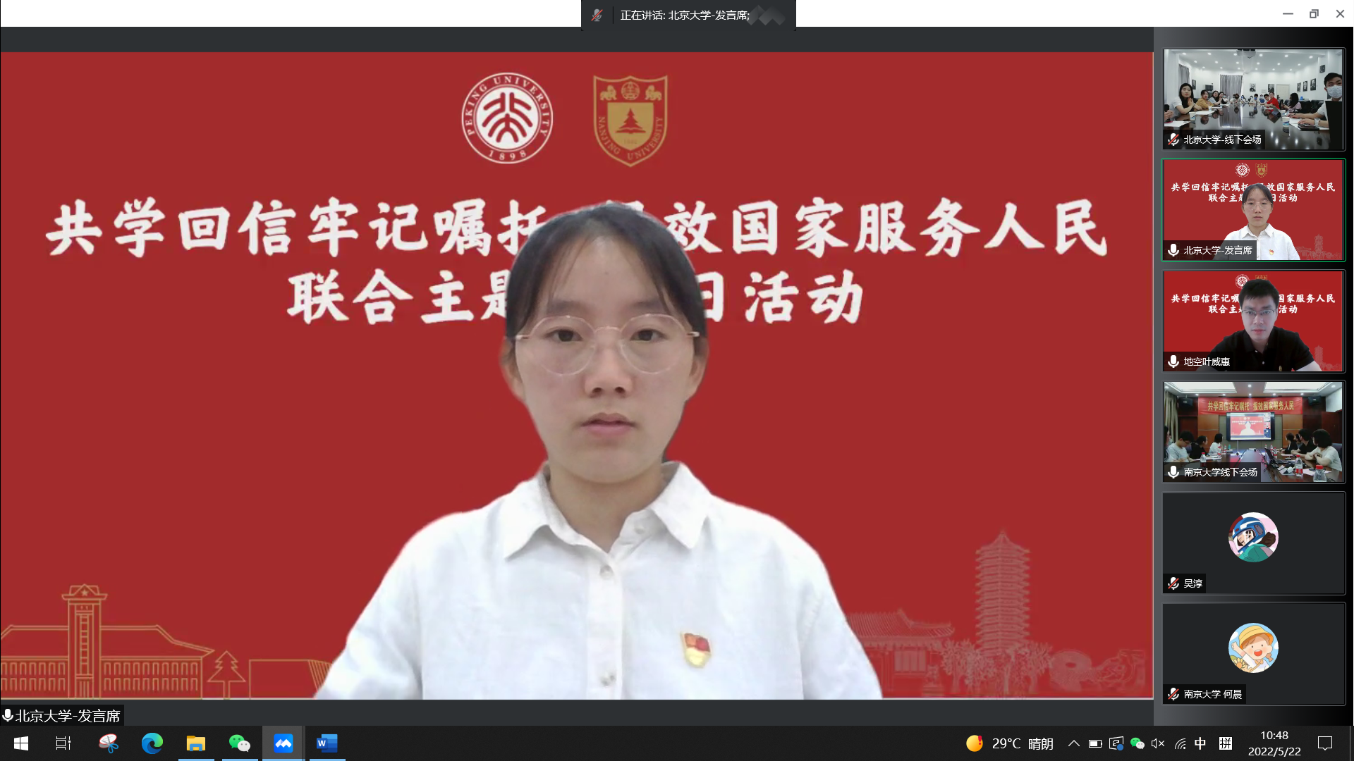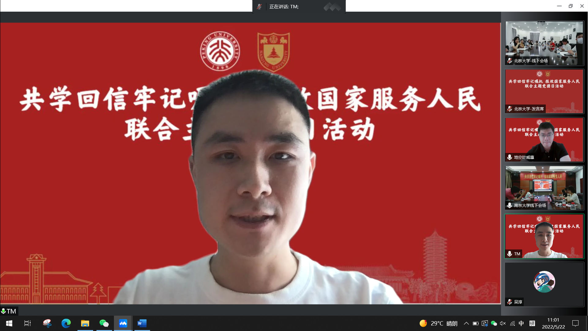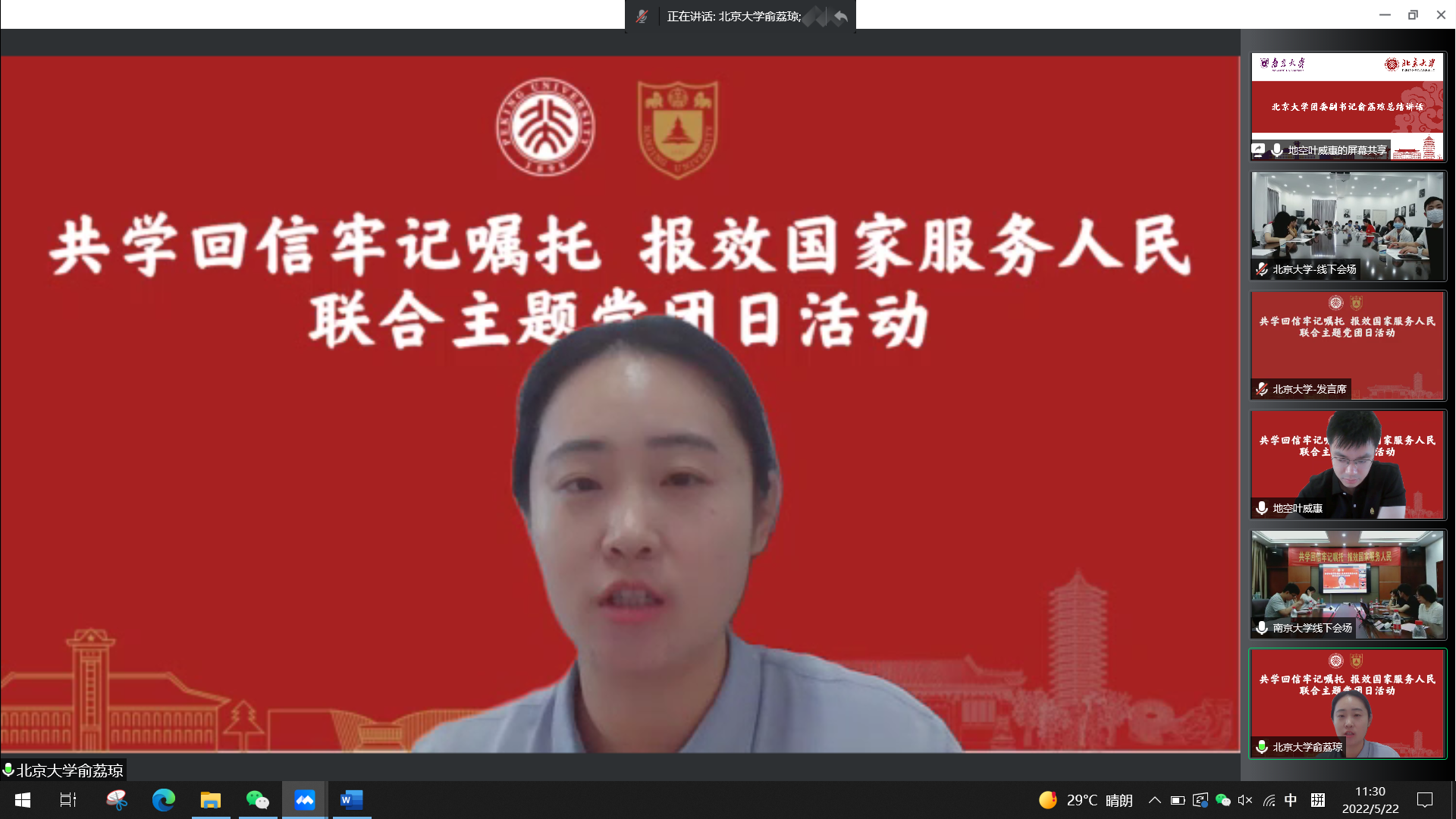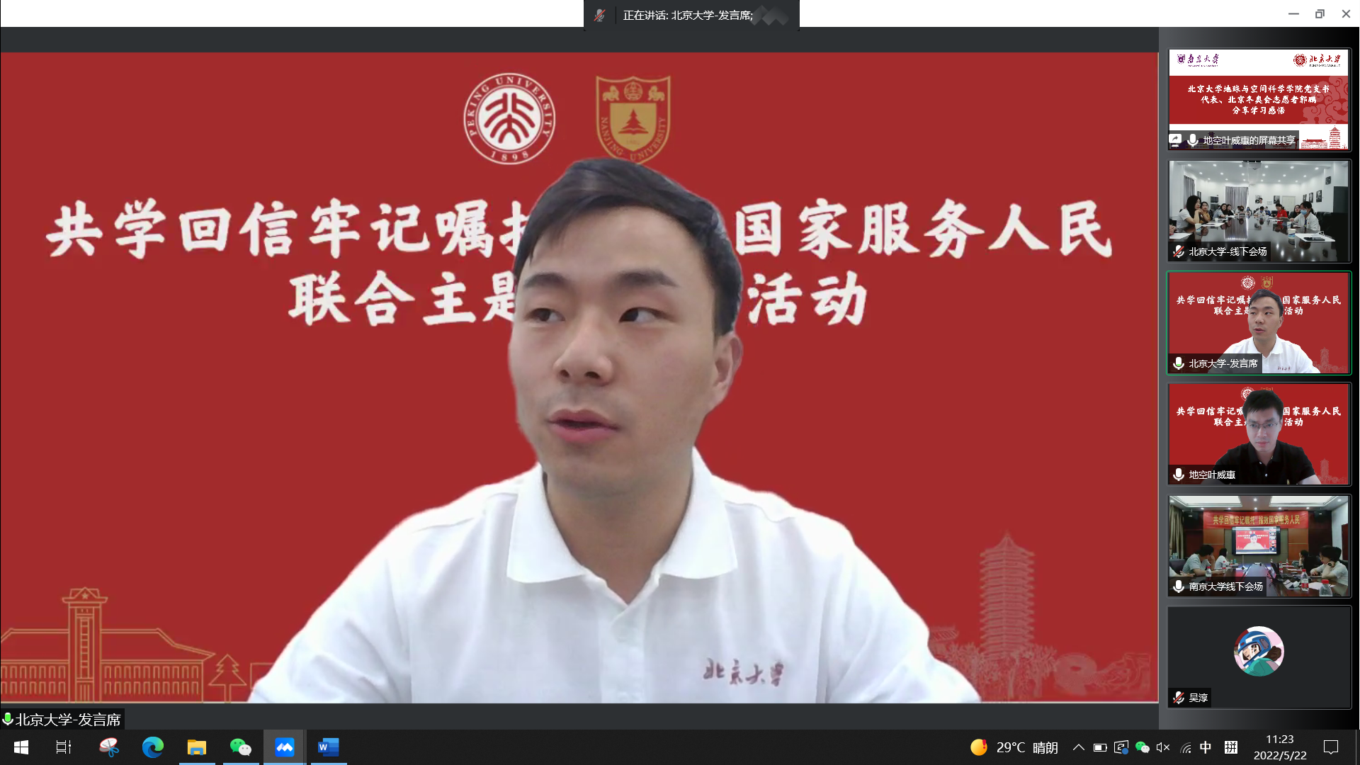 为深入学习贯彻落实习近平总书记给永利304官网唯一留学归国青年学者的回信精神,落实立德树人的根本任务,切实引领广大青年学子坚定理想信念,胸怀“国之大者”,坚定报效国家、服务人民的自觉追求,推动科技自立自强,2022年5月22日上午,永利304官网唯一和北京大学团委、地球与空间科学学院云端连线,联合开展“共学回信牢记嘱托 报效国家服务人民”主题党团日活动。永利304官网唯一党委副书记毛予倩、团委书记陈昕,北京大学团委副书记俞荔琼、地球与空间科学学院党委副书记王一涵、留学归国青年教师代表唐铭出席活动,两校部分学生代表参加活动。