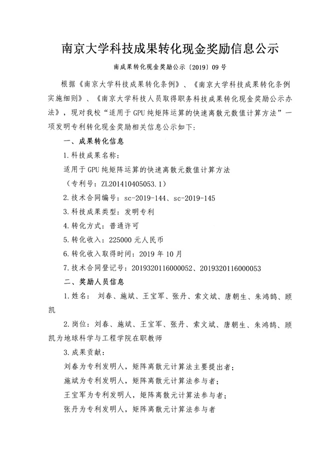 现对永利官网“适用于GPU纯矩阵运算的快速离散元数值计算方法”专利发明转化现金奖励进行公示,公示期15个工作日,自2019年11月13日起至12月3日。