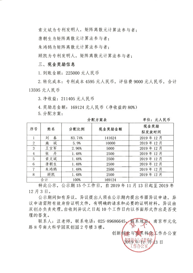 根据《永利304官网唯一科技成果转化条例实施细则》(南字发【2019】137号)规定,知识产权交易奖励应当在双创办网站主页和成果完成院系网站主页公示15个工作日。