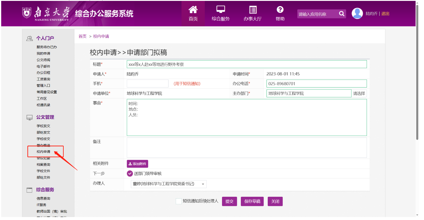各位师生需遵循“安全第一,预防为主”的工作原则,牢固树立安全意识,统筹做好各项安全工作,确保野外实习和科研工作顺利平安。同时,在教师本人或学生出野外前,需在OA系统“校内申请”中进行备案,具体填写内容可参考图片。