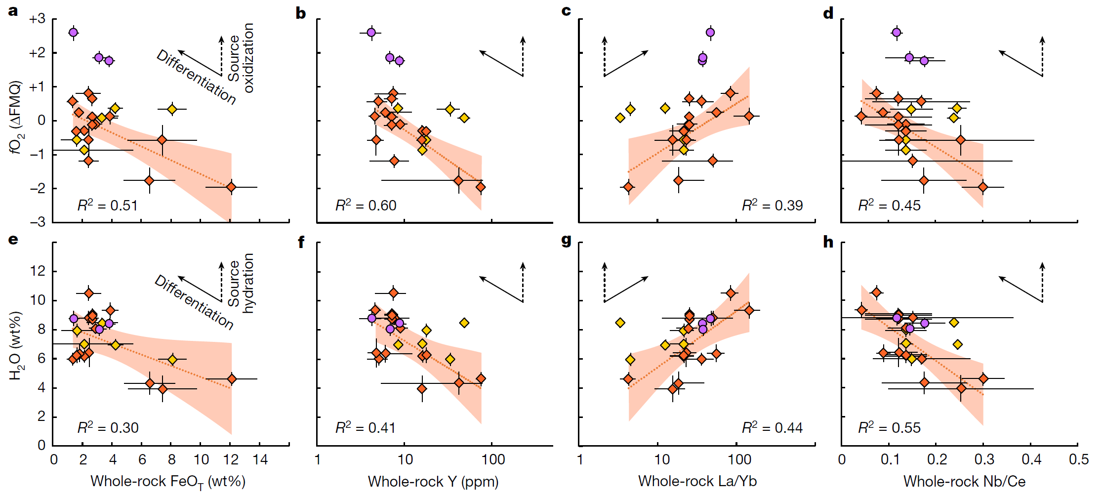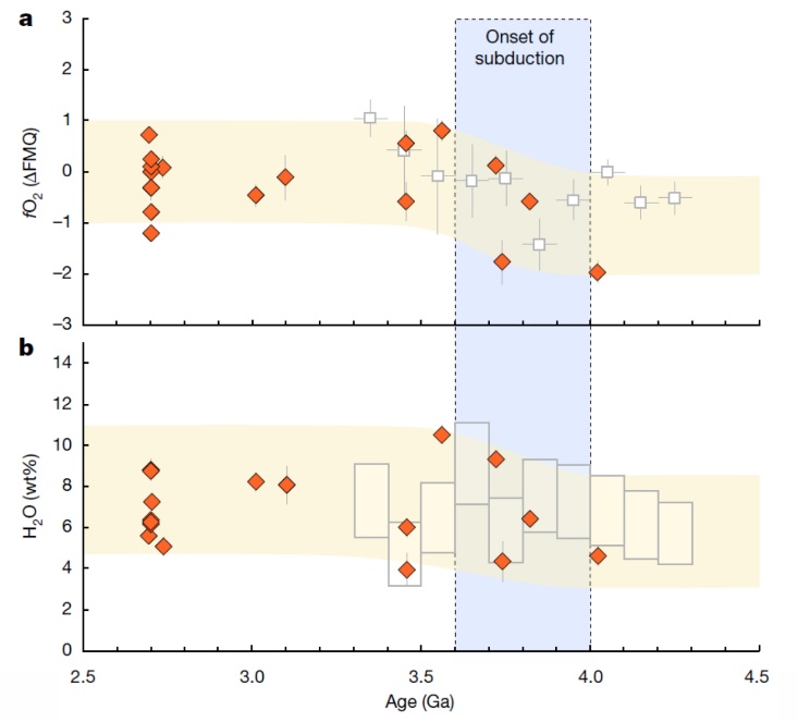 在此基础上,该研究团队计算了全球主要克拉通太古宙内花岗质岩石的岩浆氧逸度和水含量,发现大多数太古宙花岗质岩浆的氧逸度比现代岛弧岩浆低(图1b),但由于太古宙地幔本身氧逸度较低,大多数太古宙花岗质岩浆的氧逸度相对于同期幔源岩浆仍有一个数量级的升高,这种差异类似于现代岛弧岩浆相对于洋脊玄武质岩浆的变化。研究还发现,大多数太古宙花岗质岩浆具有较高的水含量(6 – 10wt%)和H2O/Ce比值(大于1000),类似于现代岛弧岩浆,且岩浆氧逸度、水含量和H2O/Ce比值均与指示岩浆形成深度的地球化学指标具有良好的相关性(图2),指示大量的水被从地表运输至深部地壳和地幔。这些观察难以用非板块俯冲模型解释,而与大洋板片俯冲、脱水、熔融及其导致的岛弧岩浆作用相吻合,说明大量的液态水(大洋)和板块构造在早期大陆起源过程中起着至关重要的作用,这也是宜居地球的形成过程区别于其他类地行星的重要原因,这一过程也对许多关键金属矿产的形成具有重要控制作用。该研究还显示,在地球形成后约5亿年的始太古代(36 – 40亿年前),初始俯冲作用的启动导致花岗质岩浆的氧逸度和水含量发生了显著的升高(图3)。