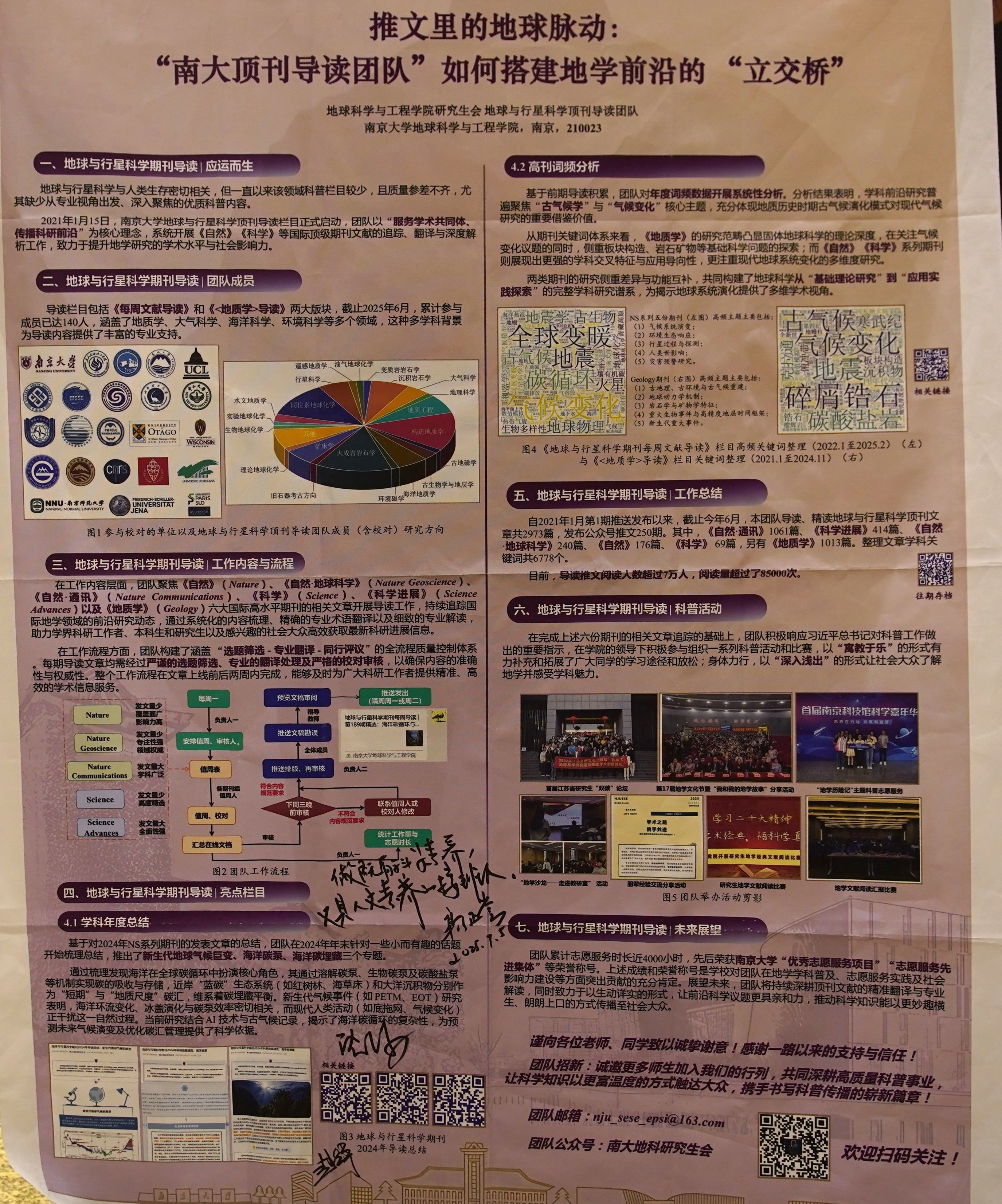 7月5日上午,在大会的科普工作圆桌论坛讨论环节,地科院董婷书记与地科院2024届毕业生、中国科学院南京地质古生物研究所博士后申博恒博士分别发言。董婷书记从招生、培养和就业三个方面,结合永利304官网唯一地科院做法经验,分享了对地球科学教育双高衔接的理解。申博恒博士作为团队主要发起人之一,向各位参会代表介绍了团队工作的内容和流程,表示来团队未来可以通过转型调整,尝试面向中小学普及地球科学研究前沿动态。中国科学院院士、中国科学院古脊椎动物与古人类研究所周忠和研究员建议团队未来可以针对国内学术期刊进一步开展科学传播工作。中国科学院院士、国家自然基金委员会地球科学部郭正堂主任,北京大学沈冰教授,中国科学院广州地球化学研究所赵太平研究员等与会专家为团队展板题字,勉励团队在科学传播工作上再接再厉。