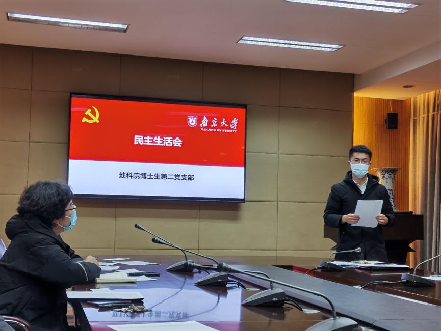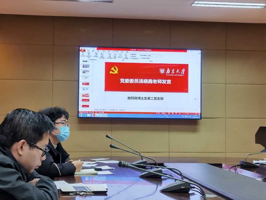 接着,石静同志作为博士生第二党支部向全体支部党员做了述职报告,详细讲述了支部这一年的基本情况变化。首先概括介绍了本支部情况,包括党员、入党积极分子人数的变化、各专业分布情况;梳理并引导大家回顾了党支部这一年组织的各类主题党日学习活动,如助力抗疫的“四个一”活动、建言“第一个南大”的云课堂活动、“学四史”主题微党课活动、一二九朗诵等等。石静同志重点提到,为响应学校提出的党建信息化,本支部已开始使用智慧党建管理服务平台,用于提交党费、管理党员发展等。石静同志对支部之后的发展也作出了规划。