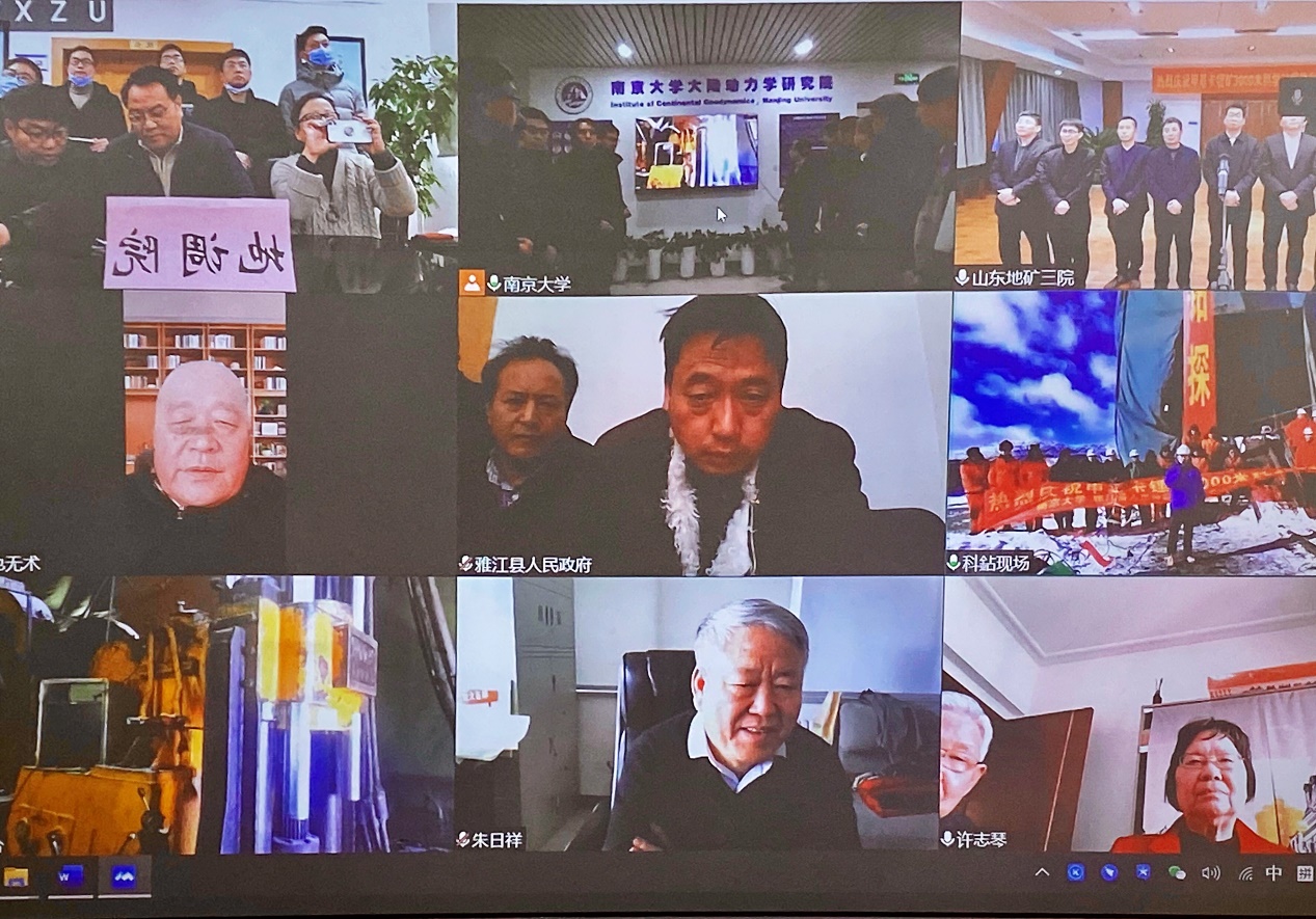 受新冠疫情影响,竣工典礼以在线方式举行。庆典当天邀请到了中国科学院地质与地球物理研究所朱日祥院士、永利304官网唯一王德滋院士和杨经绥院士三位嘉宾,以及有关单位在线参加,包括永利304官网唯一、甘孜州自然资源和规划局、雅江县人民政府、四川省地质调查院、山东第三地质矿产勘查院和中国地质大学(武汉)等。典礼由科钻现场负责的李广伟教授主持。首先,项目首席科学家许志琴院士宣布:“永利304官网唯一领衔的川西甲基卡锂矿科学钻探工程,终于实现钻探目标,钻进3211.21米,揭示了理想的锂矿岩心剖面,为实现国家新能源锂矿战略做出了贡献。现在我代表科钻指挥部宣布:川西甲基卡锂矿科学钻探正式完钻!”顷刻,甲基卡科钻现场礼炮轰鸣,场内外一片欢腾。接着,三位嘉宾朱日祥院士、王德滋院士和杨经绥院士发表热情洋溢的致辞,祝贺甲基卡科学钻探工程圆满竣工。三位院士充分肯定了钻探的重要科学意义,以及它对国家能源战略发展的重要贡献,并预祝钻探取得丰硕的科研成果。随后,永利304官网唯一地球动力学研究院院长朱文斌教授、四川省甘孜州雅江县陈玉龙县长、四川省地质调查研究院赵春院长、山东省第三地质矿床勘察研究院吉孟瑞院长,代表钻探三方单位和钻井所在地政府发言,祝贺钻探任务圆满完成。竣工仪式在一片欢欣雀跃的气氛中结束。