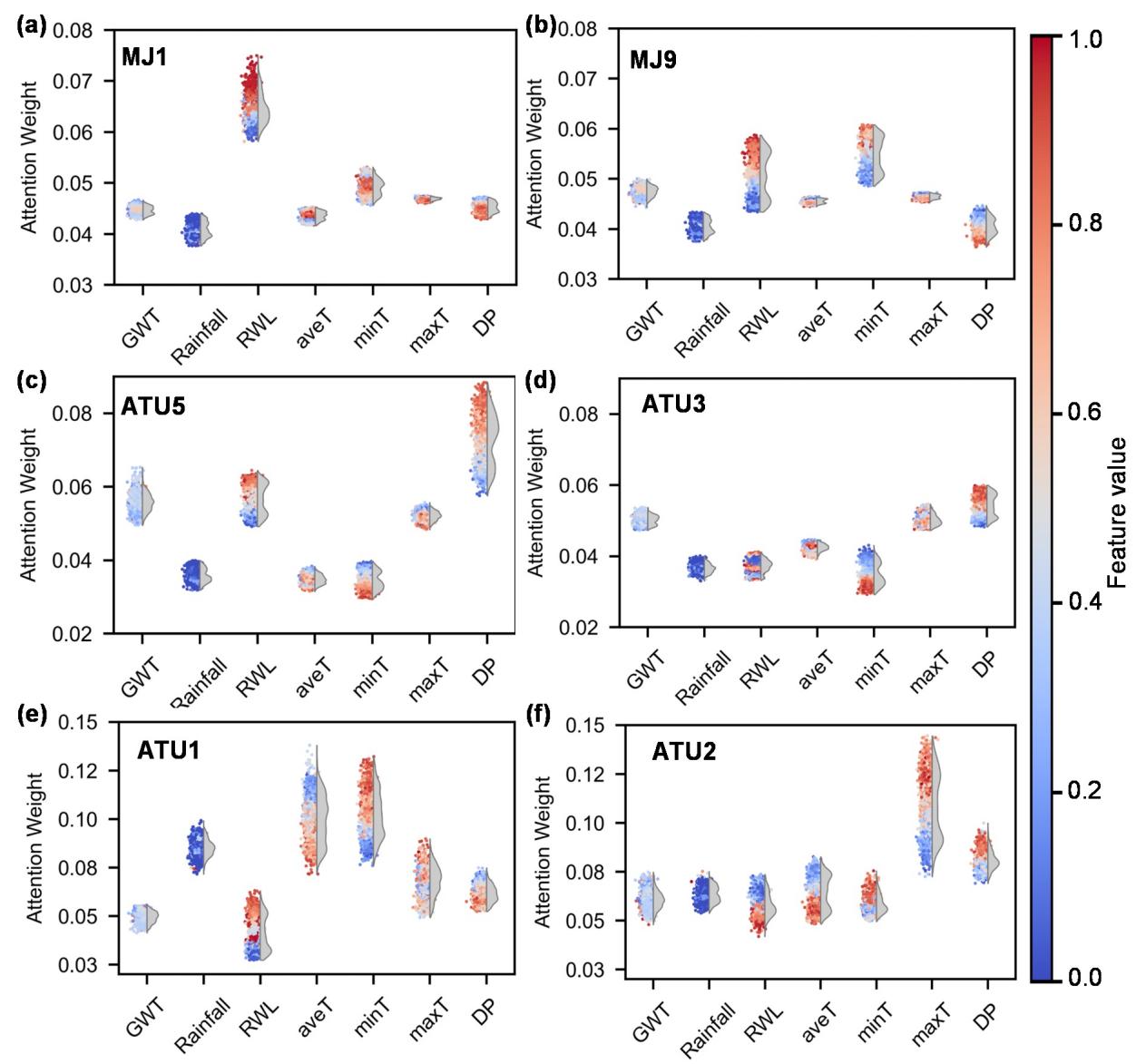 在长江三峡库区巨型顺层基岩滑坡——藕塘滑坡(图2)的案例中,研究团队依据滑坡变形的多期次特征,将滑坡体划分为O1(坡脚)、O2(中部)、O3(坡顶)三个区域,并利用图神经网络对每个区域中的测点位移监测结果进行建模分析,实现了跨点位特征共享与空间模式识别。分析结果显示,ST-GNN模型的预测精度与稳健性显著优于传统的长短期记忆网络(LSTM)、GRU等方法(图3)。同时,模型内嵌的注意力模块识别了滑坡不同位置处位移的主控因子:坡脚处位移受库水位波动主导,因其毗邻河岸;坡顶处位移则对降雨和气温变化更为敏感,反映日照诱发地表干裂,进而对入渗路径有调控作用(图4)。本研究揭示的这种空间变异现象为深入理解藕塘滑坡变形的主控机制、设置分区化预警阈值及差异化治理策略提供了科学依据。