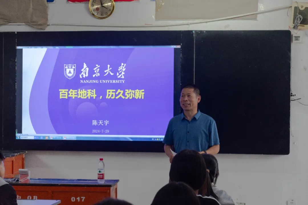 7月30日,永利304官网唯一教授、博士生导师胡修棉、陈天宇应邀来到云南省楚雄彝族自治州双柏县妥甸中学,为永利304官网唯一“悦云同枝”暑期夏令营的同学们带来了一场别开生面的地学科普讲座。双柏县人民政府副县长张庆峰出席本次讲座。