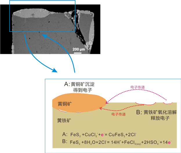 图1. 氧化还原耦合的溶解-沉淀机制。黄铜矿取代黄铁矿过程需要额外电子供给,电子可通过黄铁矿氧化溶解提供。