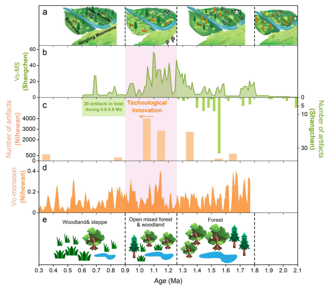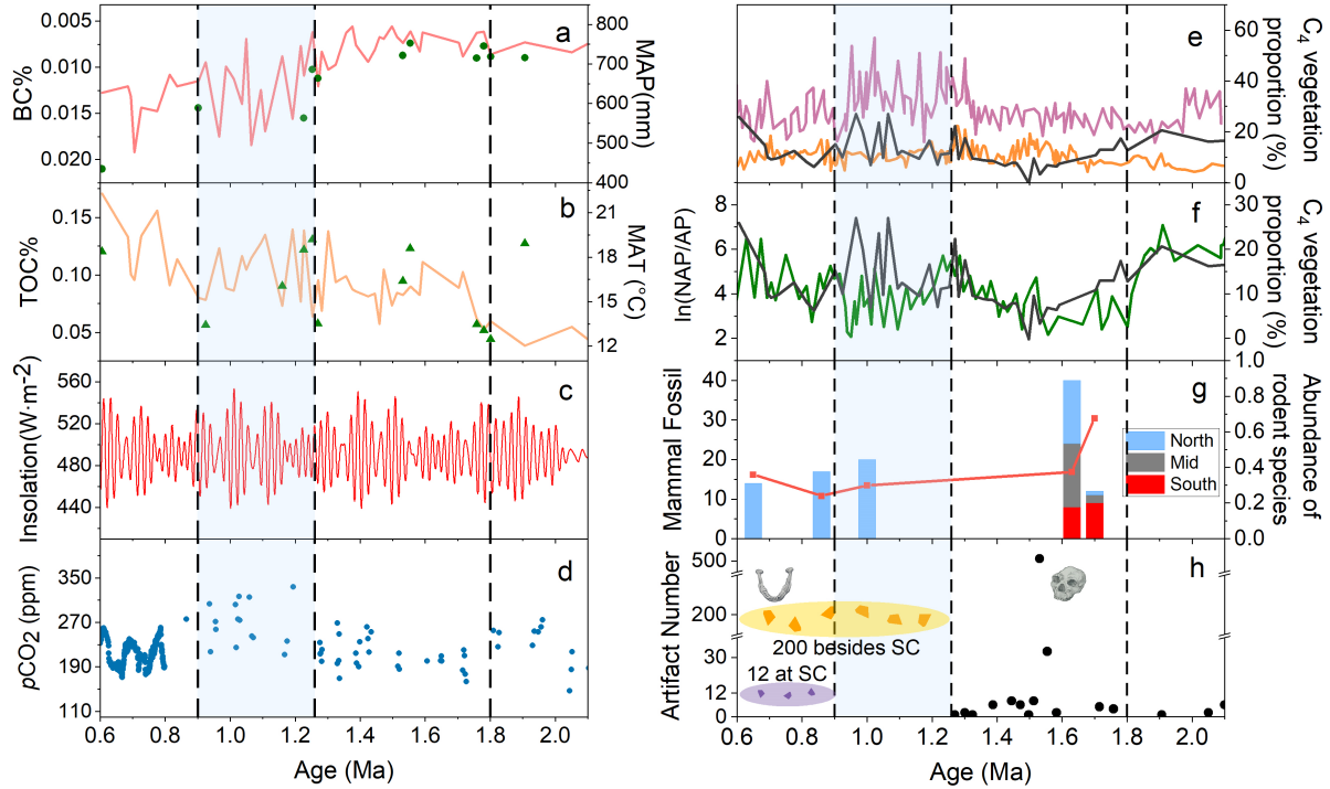 研究发现,自~1.26 Ma以来上陈地区的气候环境呈现长期冷干化 (图2c,f)、C4草本植物扩张趋势(图2d),而在中更新世转型期早期(简称MPT早期,~1.26–0.9 Ma)气候环境变率突然增高(如图2i-k所示,基于各指标记录插值后移动标准差的计算)。上陈剖面石器在MPT早期的突然消失表明,叠加于干旱化和C4草本植物扩张趋势的气候环境高变率可能导致了该地区此时期古人类的迁徙或灭亡。此外,通过比较0.9–0.6 Ma和1.8–1.26 Ma这两个阶段气候与石器变化,我们发现在气候环境变率均较低的情况下,长期干旱化及C4草地扩张趋势明显抑制了古人类活动的繁荣(图3中0.9–0.6 Ma石器明显变少)。
