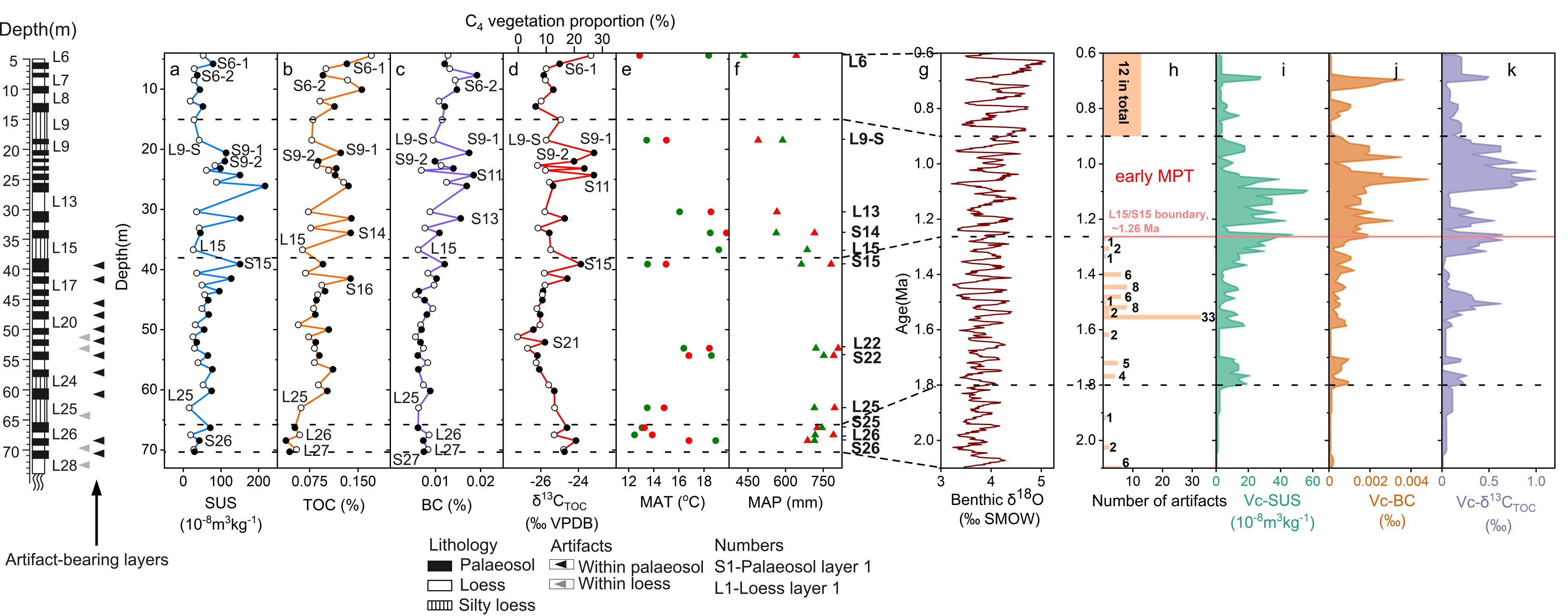 图2. 上陈剖面~2.1–0.6Ma气候环境指标记录(a-d, 及e、f中的绿点)、气候环境变率变化(i-k)及与深海氧同位素记录(g)、上陈石器序列(h)的对比