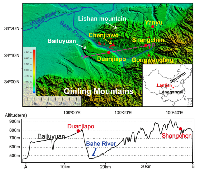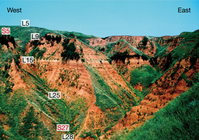 图1. 上陈剖面位于中国黄土高原东南缘、秦岭北部的蓝田地区,其他为文章中提及的遗址或研究剖面点(左图);右图为上陈剖面照片(改自Zhu et al., 2018)