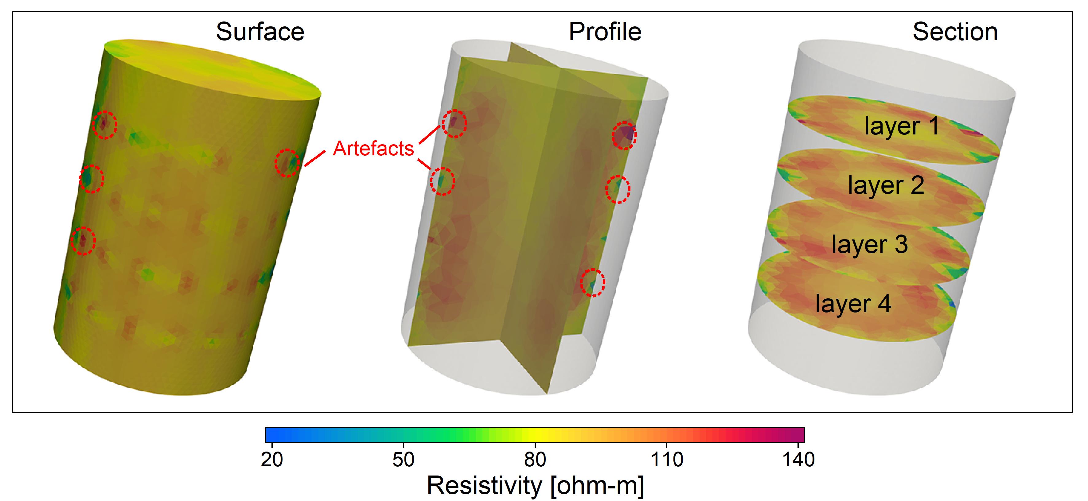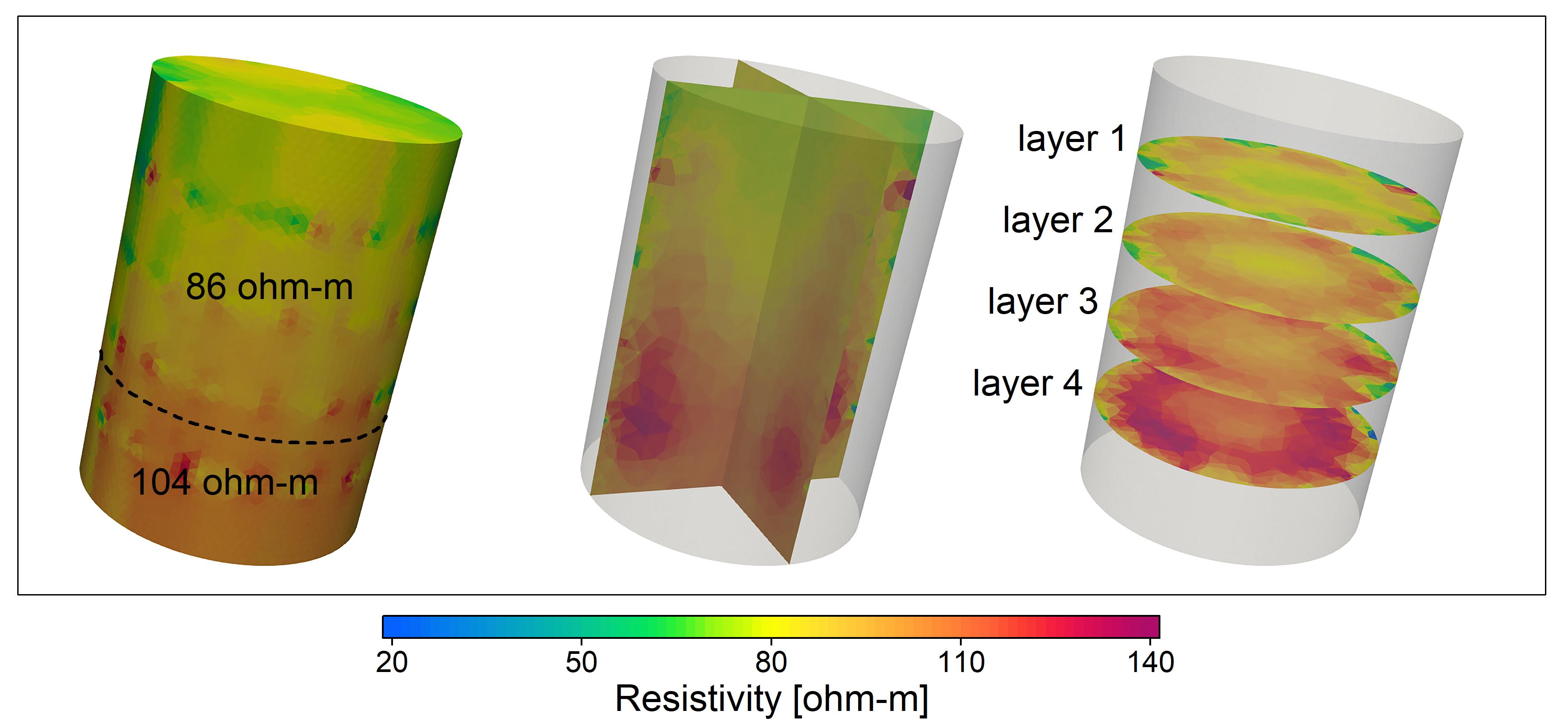 电阻率层析成像 (ERT)是一种非破坏性的地球物理方法,在监测 MICP处理方面具备较大的潜力。为此,永利官网唐朝生教授课题组采用自主开发的ERT测试及反演系统,在国际上率先实现了微生物改性砂土全过程的持续精细监测。通过采集不同处理阶段的直流电阻率信号,利用电阻率模型直观地表征了微生物浆液在砂土中的时空迁移与分布特征。此外,研究发现电阻率变化与MICP处理过程中的尿素水解和碳酸钙沉淀有较好的对应关系,处理后的电阻率分布特征与碳酸钙沉淀分布特征呈现较好的一致性。基于上述试验结果,揭示了微生物诱导碳酸钙沉淀影响砂土电阻率的机制,并进一步构建了二者之间的定量关系。