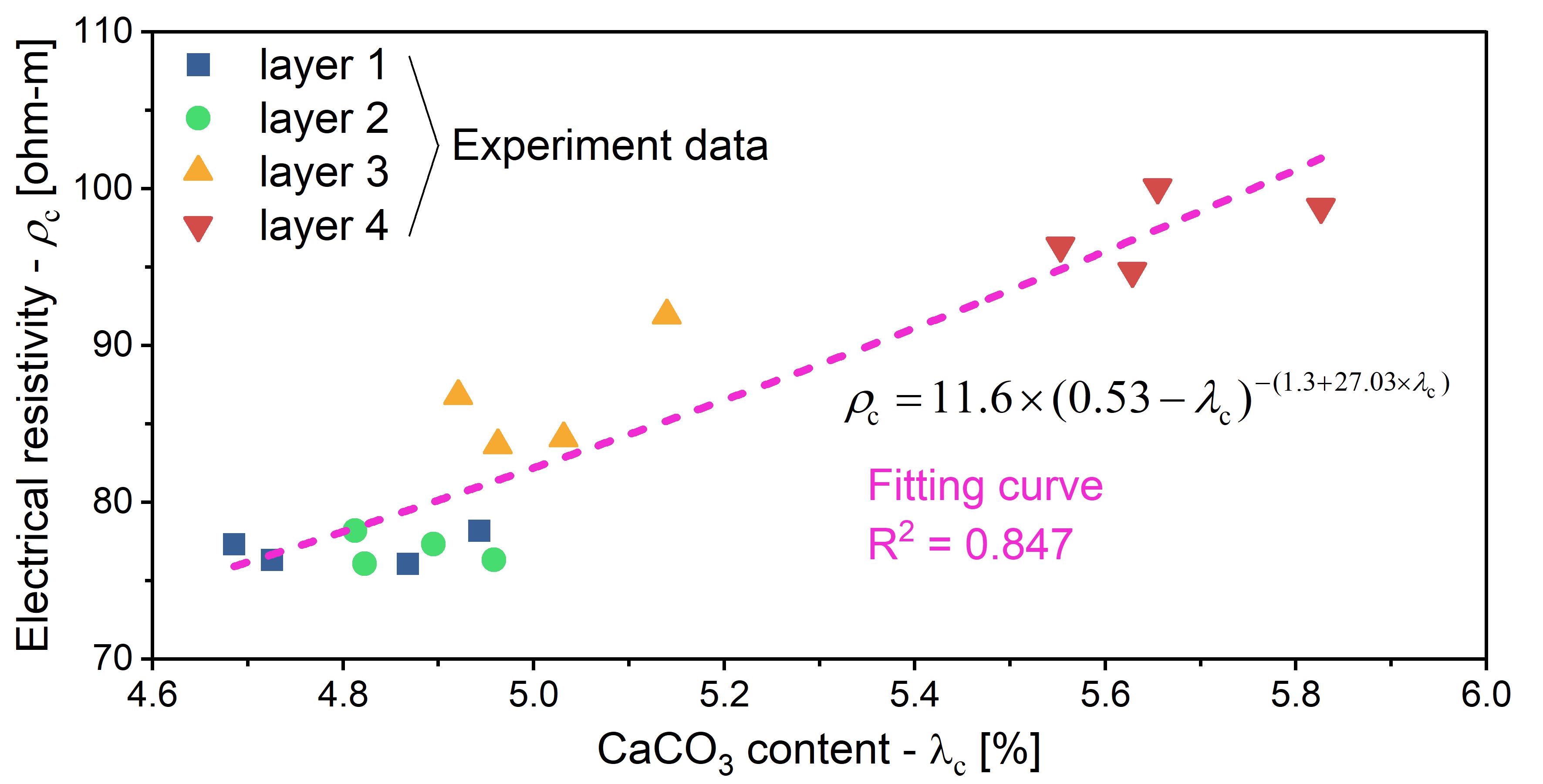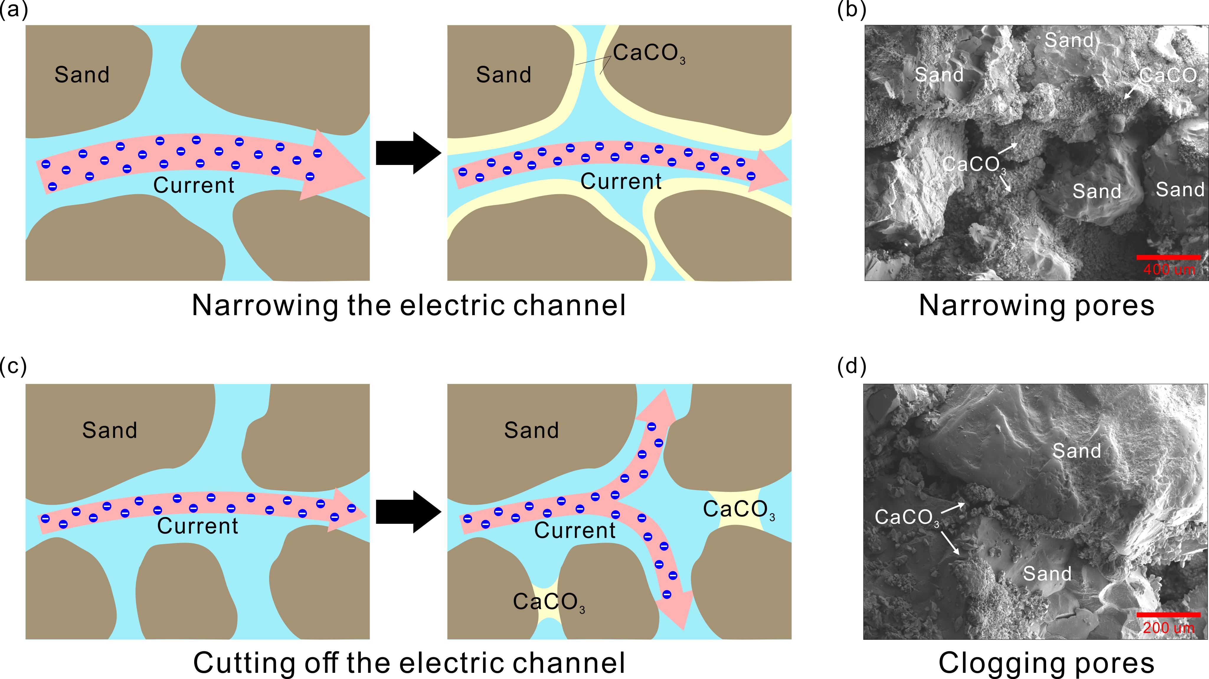 图2 碳酸钙沉淀影响砂土电阻率的机制及其定量关系