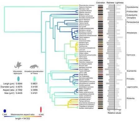 图1:现生哺乳动物黑素体几何形态与毛发色彩的关系
