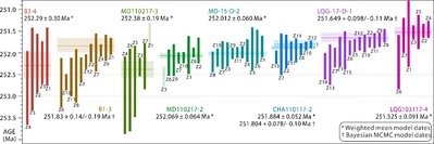二叠纪末(约2.52亿年前)的生物大灭绝是地球有生命以来最严重的一次生态危机事件,大规模火山喷发被认为是导致这次生态危机、环境快速恶化以及生物大灭绝的主要原因。然而,这次生态危机在不同纬度带的响应过程是否一致长期以来并不清楚。解决争议的关键是寻找当时火山喷发落下的火山灰,对其中保存良好的锆石,利用CA-ID-TIMS方法开展高精度锆石U-Pb同位素测年,获得不同地区生物大灭绝发生的精确地质年龄,同时开展不同纬度带的生物多样性大数据研究。