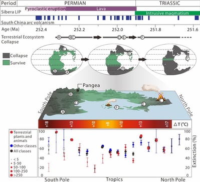 以往的研究显示位于南方高纬度带的澳大利亚东部陆地生物大灭绝发生在大约2.5231亿年前,相对海洋生物大灭绝发生得更早。那么低纬度地区陆地生物大灭绝与海洋生物大灭绝发生的时间关系是怎样的呢?我国西南地区是研究低纬度地区陆相生物大灭绝的理想地区,发育了连续的二叠纪-三叠纪之交陆相、海陆过渡相地层,记录了二叠纪末陆地生物大灭绝的发生过程。针对该科学问题,我中心沈树忠院士团队经过多年的努力,通过系统的野外火山灰样品采集,团队成员赴美国麻省理工学院同位素实验室,利用CA-ID-TIMS方法对其中的锆石开展了高精度U-Pb同位素年代测定,共获得8个高精度地质年龄。通过对年龄数据的详细分析以及全球对比,首次精确限定了低纬度地区二叠纪末陆地生物大灭绝的时间和模式,揭示了低纬度地区陆地生态系统开始崩溃的时间比海洋生物大灭绝开始的时间推迟了至少6万年。另外,本次研究获得的高精度年龄也精确地揭示了二叠纪末生物大灭绝随纬度的发展次序,大灭绝最早在二叠纪长兴期末期开始于高纬度地区,逐渐推进到中纬度地区,最终于三叠纪早期在低纬度地区结束。高纬度和低纬度的陆地生态系统对环境恶化的响应速度展现出较大差异,其时间差异长达约65万年。研究团队同时利用古生物大数据开展了全球生物多样性纬度梯度变化研究,运用多种统计方法估算不同古纬度带的陆地生物灭绝率,结果显示低纬度地区的生物灭绝不仅发生得较晚,灭绝率也相对较低,可能指示低纬度地区陆地生态系统抗环境压力的能力更高。