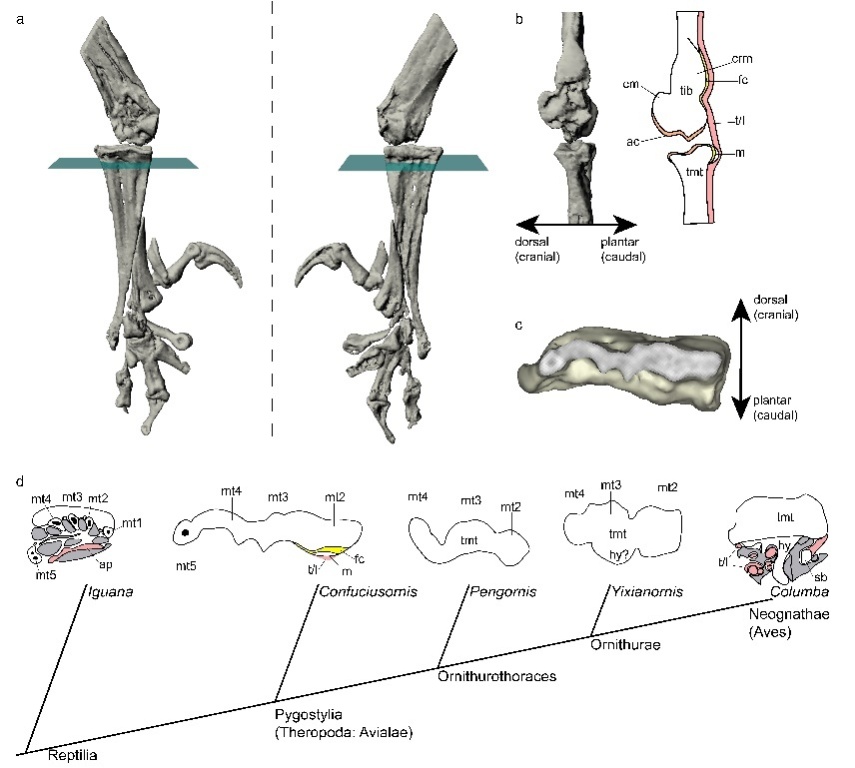 非鸟类恐龙在向鸟类演化过程中后肢发生了很多改变,如行走姿势由近于直立转变为屈膝行走,出现了可以对握并且具有很强的抓握能力的脚趾等。与之对应,鸟类踝关节(功能上对应于人类膝盖)出现了下跗骨、胫骨软骨和跗骨间籽骨等特化结构。这些特化结构改变了鸟类复杂的肌腱系统对单个脚趾活动的控制和力矩,从而提高了鸟类脚趾抓握的精度和力量,这对于鸟类的飞行和捕食都具有重要的意义。由于缺乏化石的证据,这些鸟类后肢特化结构何时和如何演化而来还不清楚。