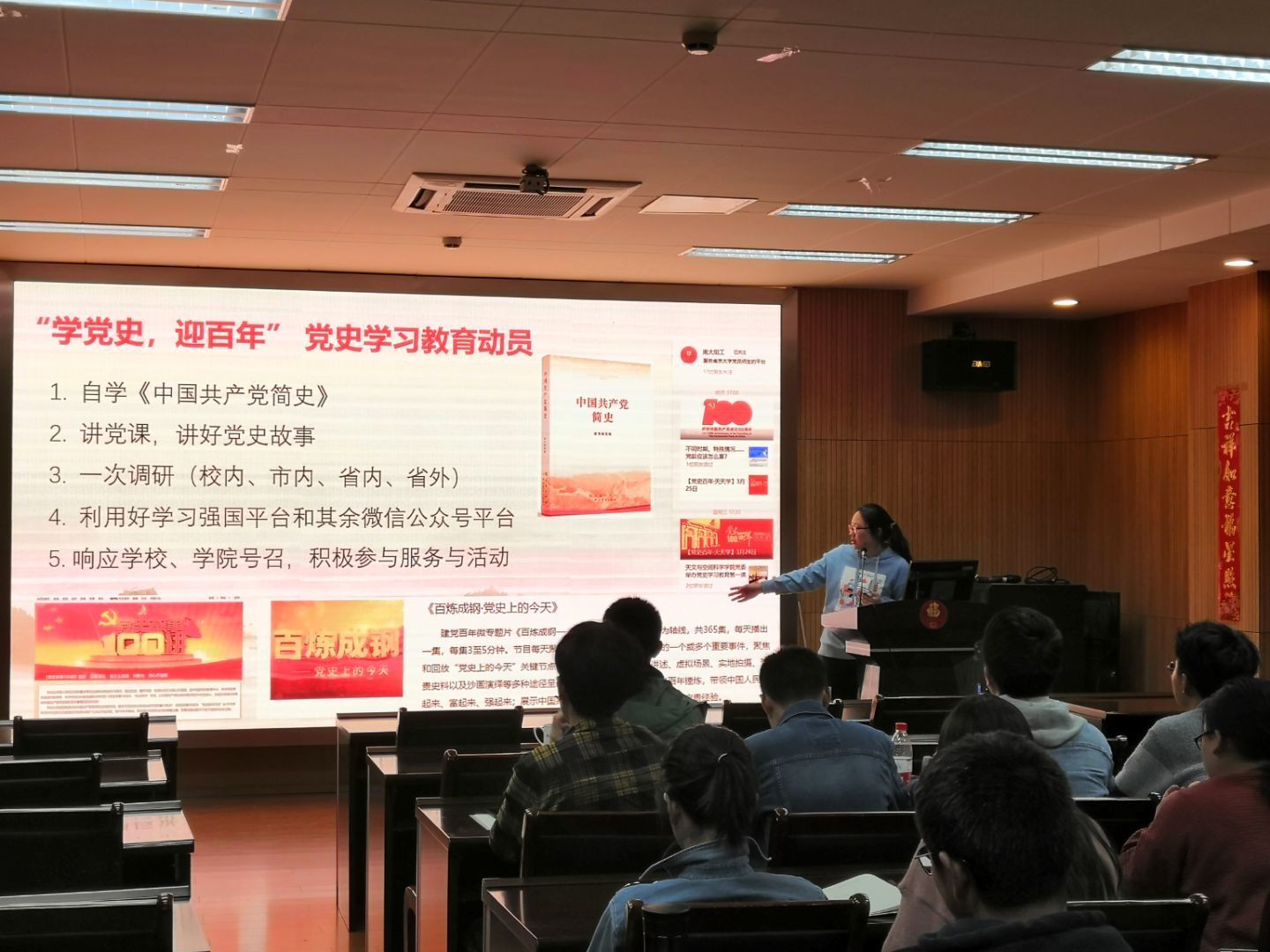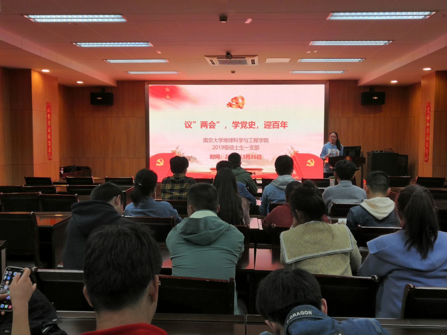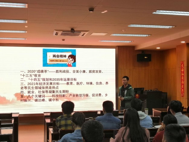 值“两会”顺利召开和庆祝中国共产党建党100周年之际,为加强党史教育学习,认真贯彻学习“两会”工作报告内容,2019级硕士生一支部于3月26日晚19:00开展了“议 ‘两会’,学党史,迎百年”的主题党日活动,会议由支部书记查日环主持。此次主题党日的主要内容包括:三月份国内外大事要闻学习;“两会”政府工作报告学习;党史学习教育动员。以党史学习动员融入“党”味,迎百年全新版块“每月大事记”和“两会”学习融入融入“鲜”味,号召党员们针对主题内容谈认识说感想融入“实”味,三“味”一体充分发挥主题党日的强化党员意识,不忘初心使命的作用。