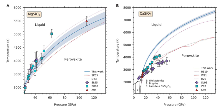 地幔矿物的熔点是制约地球深部结构及其动力学演化的关键参数。毛钙硅石(davemaoite, CaSiO3)是近年来新发现的一种高压矿物,在下地幔中的含量仅次于布里奇曼石和铁方镁石,根据推测,其含量约占整个下地幔体积的5-10%,在俯冲洋壳中的含量甚至高达30%。因此,厘定其熔化温度对于研究地球和类地行星内部的组成、结构与演化具有重要的启示意义。由于毛钙硅石在常温常压环境下不能稳定存在,当压力卸载以后它会退变为无定形结构,这使得毛钙硅石物理化学性质的实验研究非常困难;同时,在高温下毛钙硅石晶体的原子振动具有强烈的非简谐效应,使用常规的理论计算方法不能很好地处理这种矿物。鉴于目前已有的研究结果关于毛钙硅石的熔化温度存在着巨大的争议,成都理工大学行星科学国际研究中心尹坤博士和永利官网陆现彩教授等在前期提出过热熔化新视角 (Phys Rev. B (2018) 98, 144113) 的基础上,利用基于密度泛函理论的第一性原理分子动力学方法,系统开展了毛钙硅石熔化温度的理论计算,获取了毛钙硅石在高达136万倍大气压——相当于地球核幔边界的压力——下的熔化温度,并且用机器学习方法构建了经验力场,对第一性原理模拟的结果进行了验证。结果显示,毛钙硅石在核幔边界的熔化温度高达7700±150 K,比太阳表面的温度(约5500-6000 K)还要高近两千度,远远高于前人根据低压下实验研究结果外推的熔点温度。如果毛钙硅石的熔点确实像本研究预测的这么高,将对之前关于地球内部物质演化的很多模型带来挑战。毛钙硅石在地球内部极其难熔这一特性的发现对于研究早期岩浆洋的演化过程以及现今固体地幔岩石的流变学行为等都将具有重要影响。